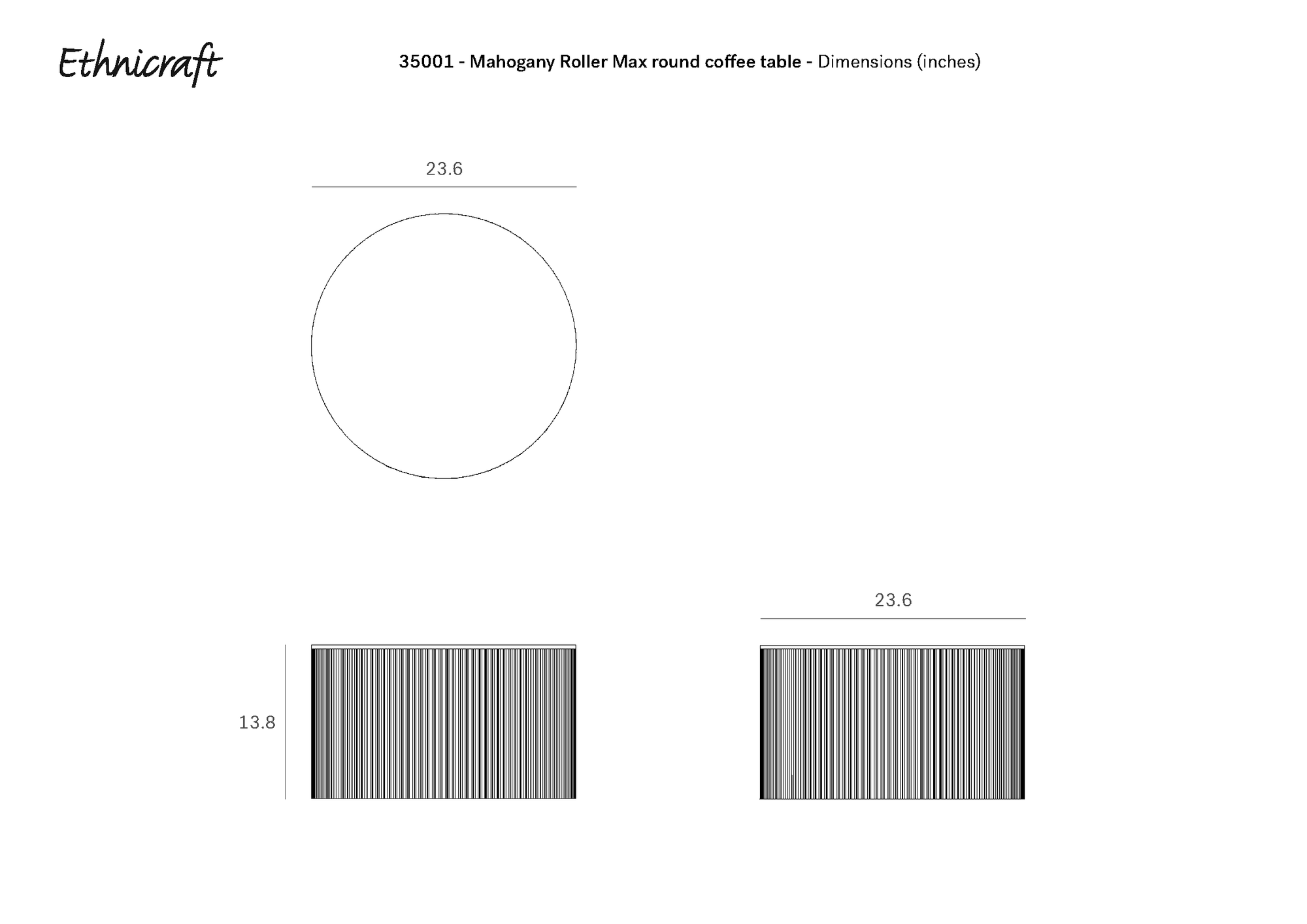 Diagram of the Ethnicraft Roller Max Coffee Table - Mahogany, showing top and side views with dimensions: 23.6 diameter x 13.8 height, highlighting its elegant design and functional storage space.