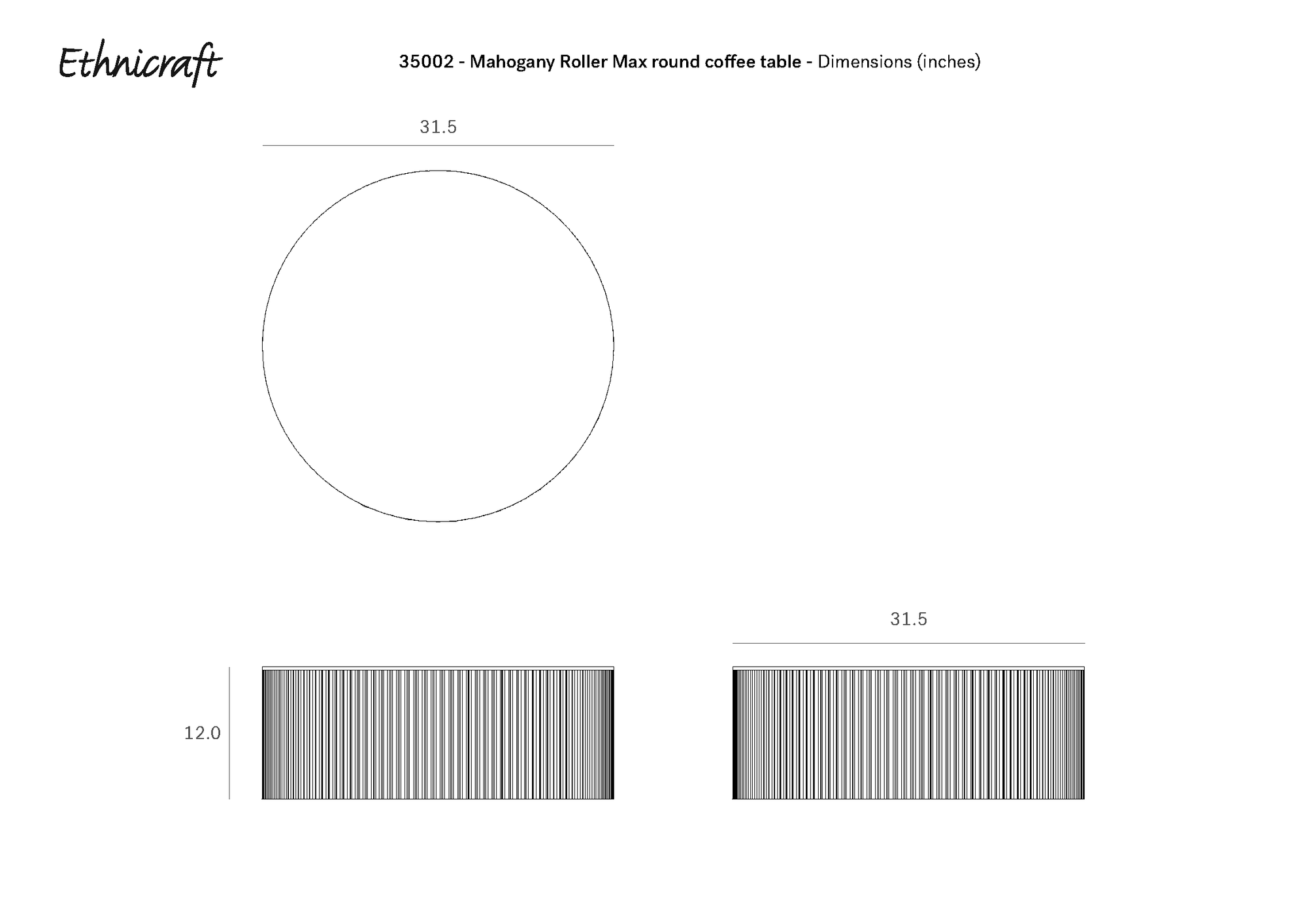 Diagram of the Ethnicraft Roller Max Coffee Table - Mahogany, showing top and side views with dimensions: 31.5 diameter, 12 height. Features hidden storage inside its elegant round design.