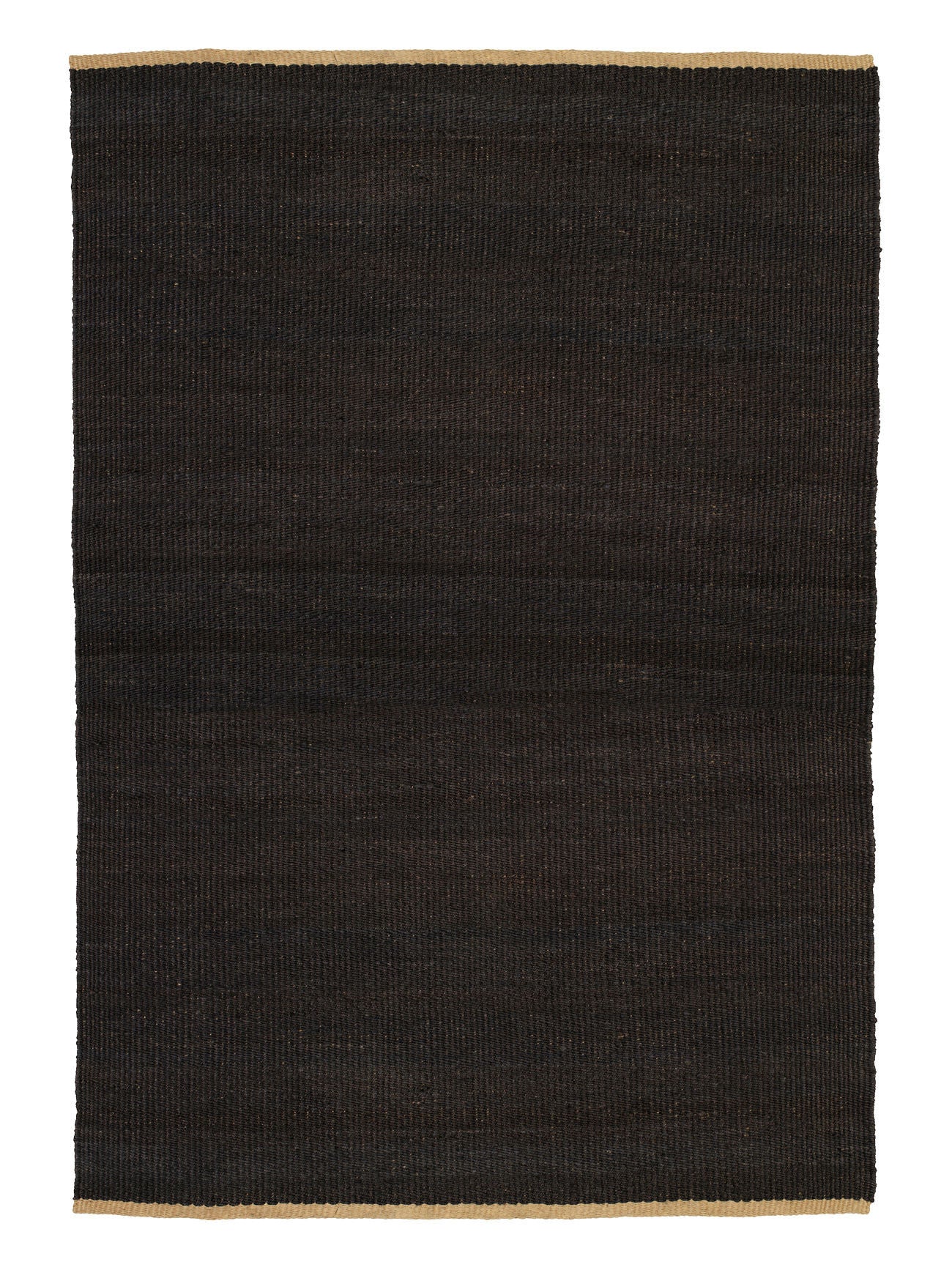 A close-up of the Armadillo&Co Nest Rug - Charcoal highlights its dark, tightly woven threads with a visible organic weave and texture, finished with a light brown border along the top edge.
