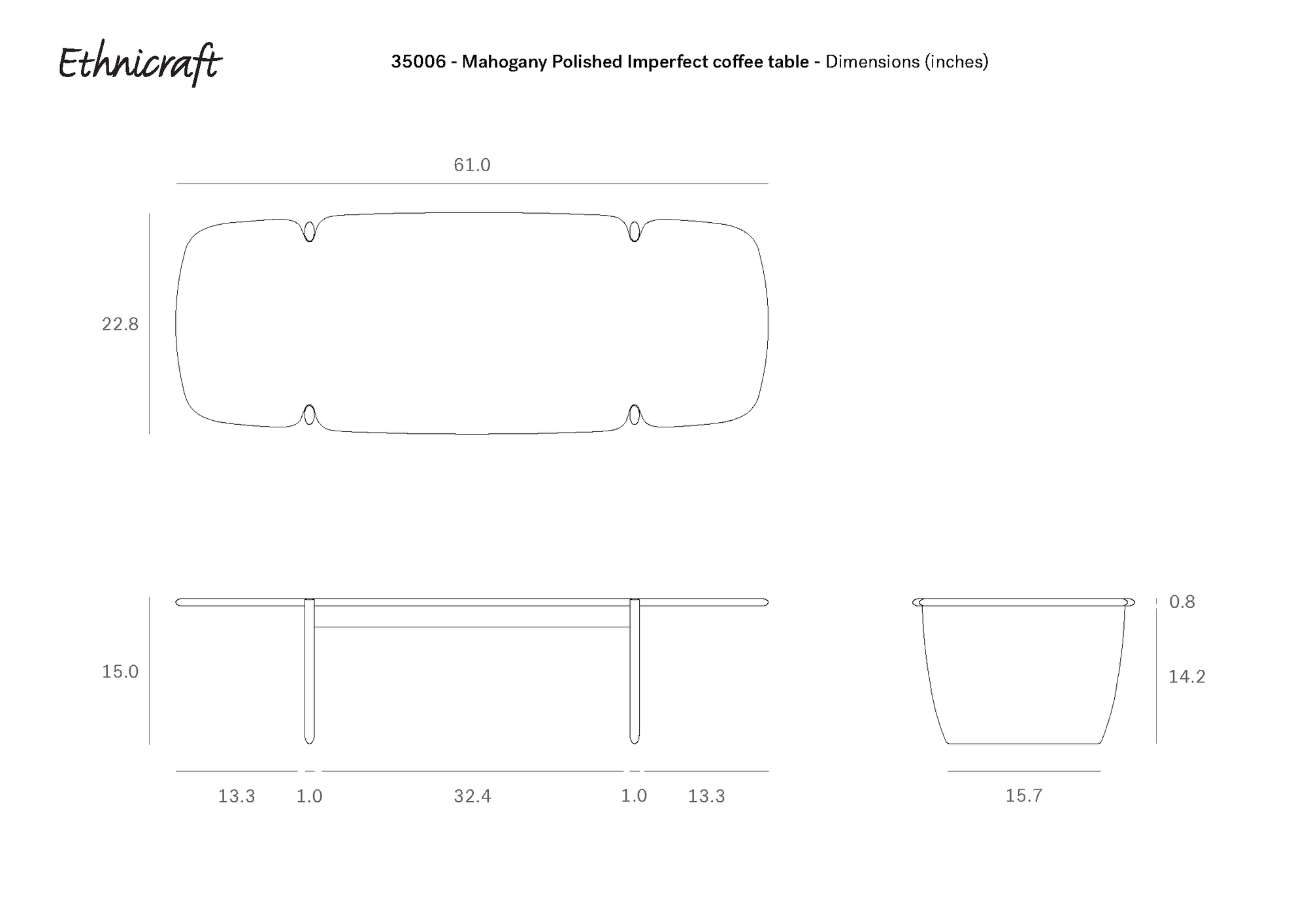 Line drawings show the top, side, and front views of the Ethnicraft PI Coffee Table - Mahogany with rounded edges. Dimensions in inches are labeled: 61 (L) x 22.8 (W) x 15 (H).
