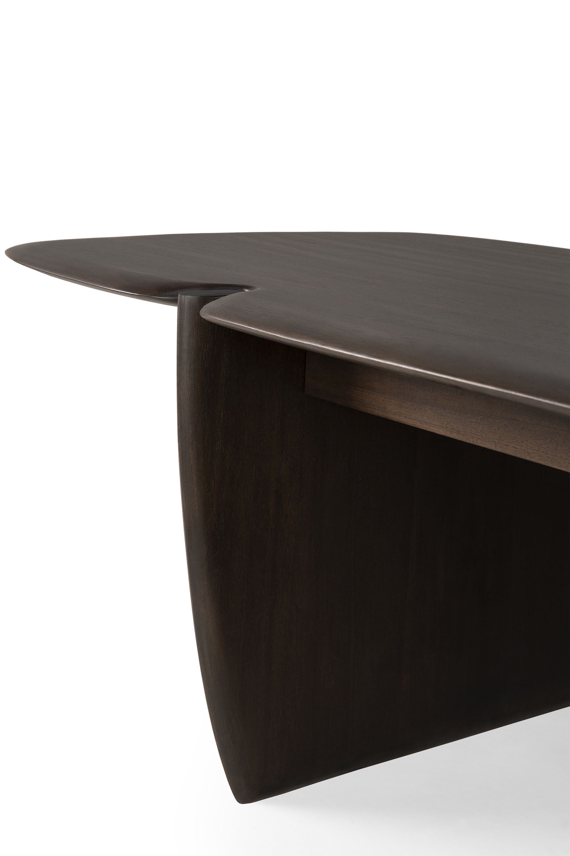 A close-up view of the Ethnicraft PI Coffee Table in solid mahogany, showcasing smooth curved edges and an organic, sculptural design.