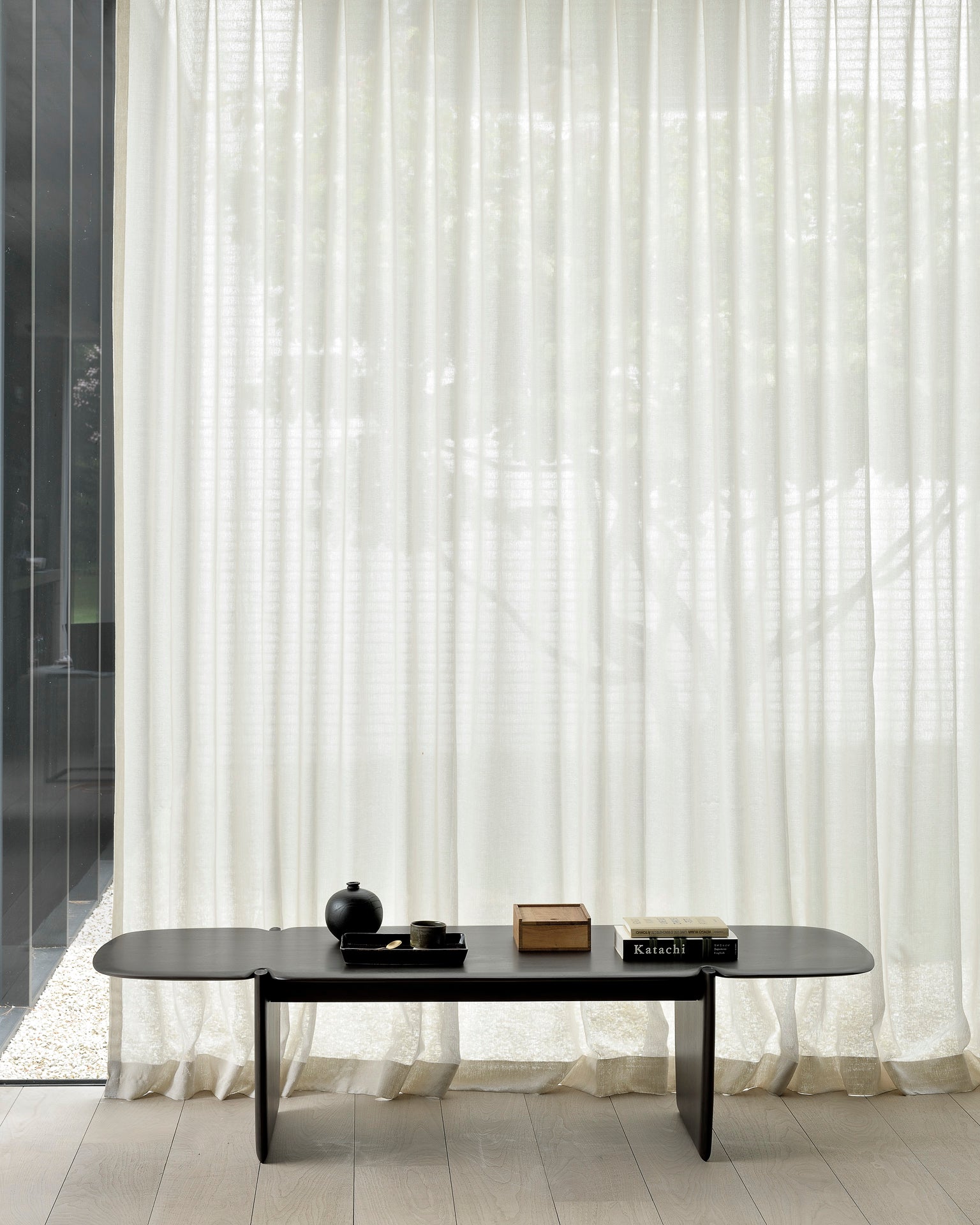 The PI Coffee Table - Mahogany by Ethnicraft, topped with decor and books, stands before sheer white curtains as natural light brightens the serene modern space with light wooden floors.