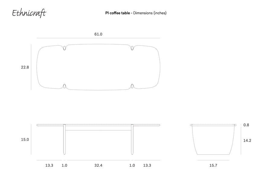 Line drawings of the Ethnicraft PI Coffee Table - Oak, showing top, side, and end views with dimensions in inches: 61 long, 22.8 wide, 15 high. Ethnicraft logo appears in the top left corner.