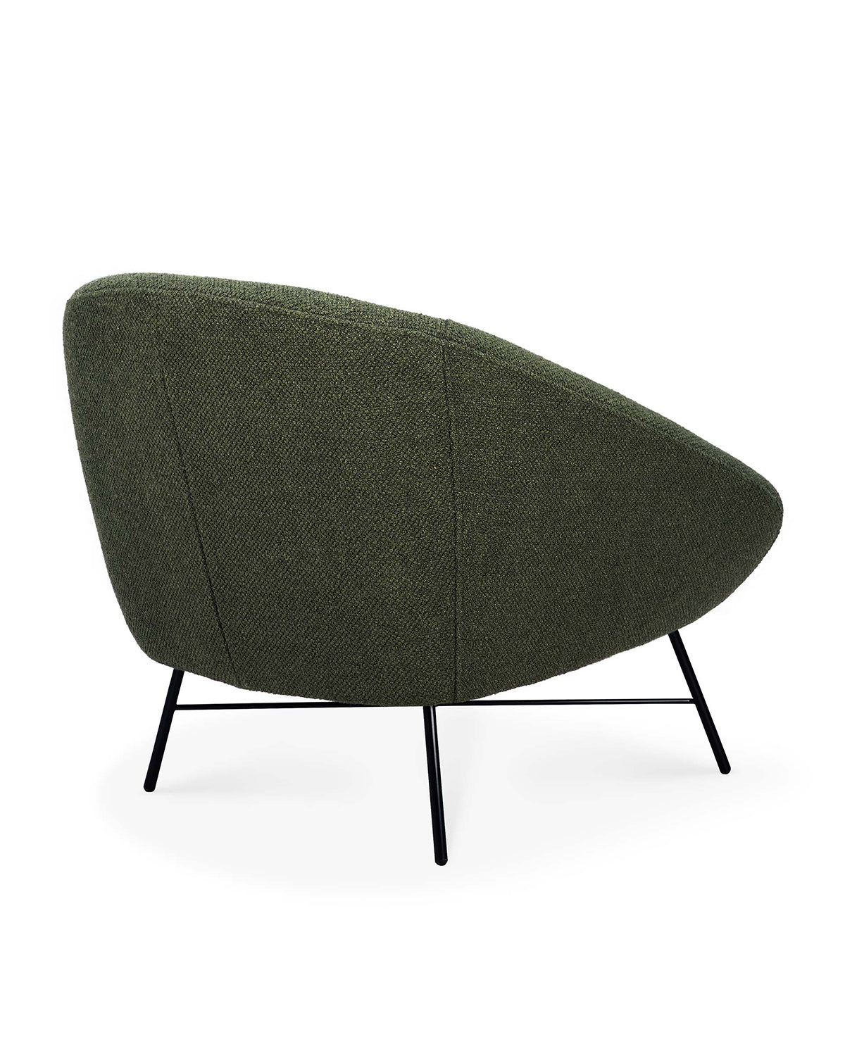 The Ethnicraft Barrow Lounge Chair - Pine features a rounded back, sleek black metal legs, and is shown in pine green fabric from a rear side angle against a white background, offering a modern seat with vintage flair.