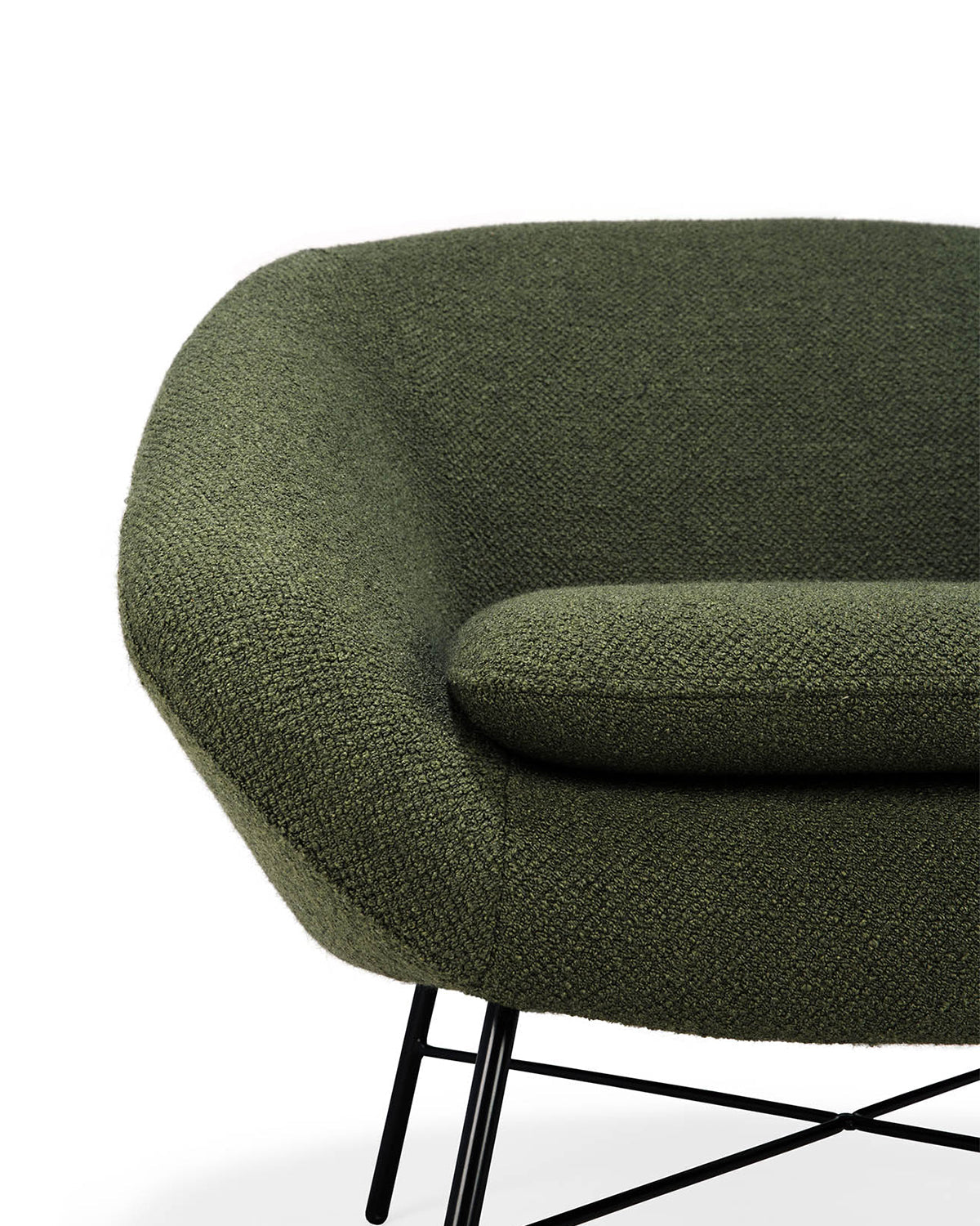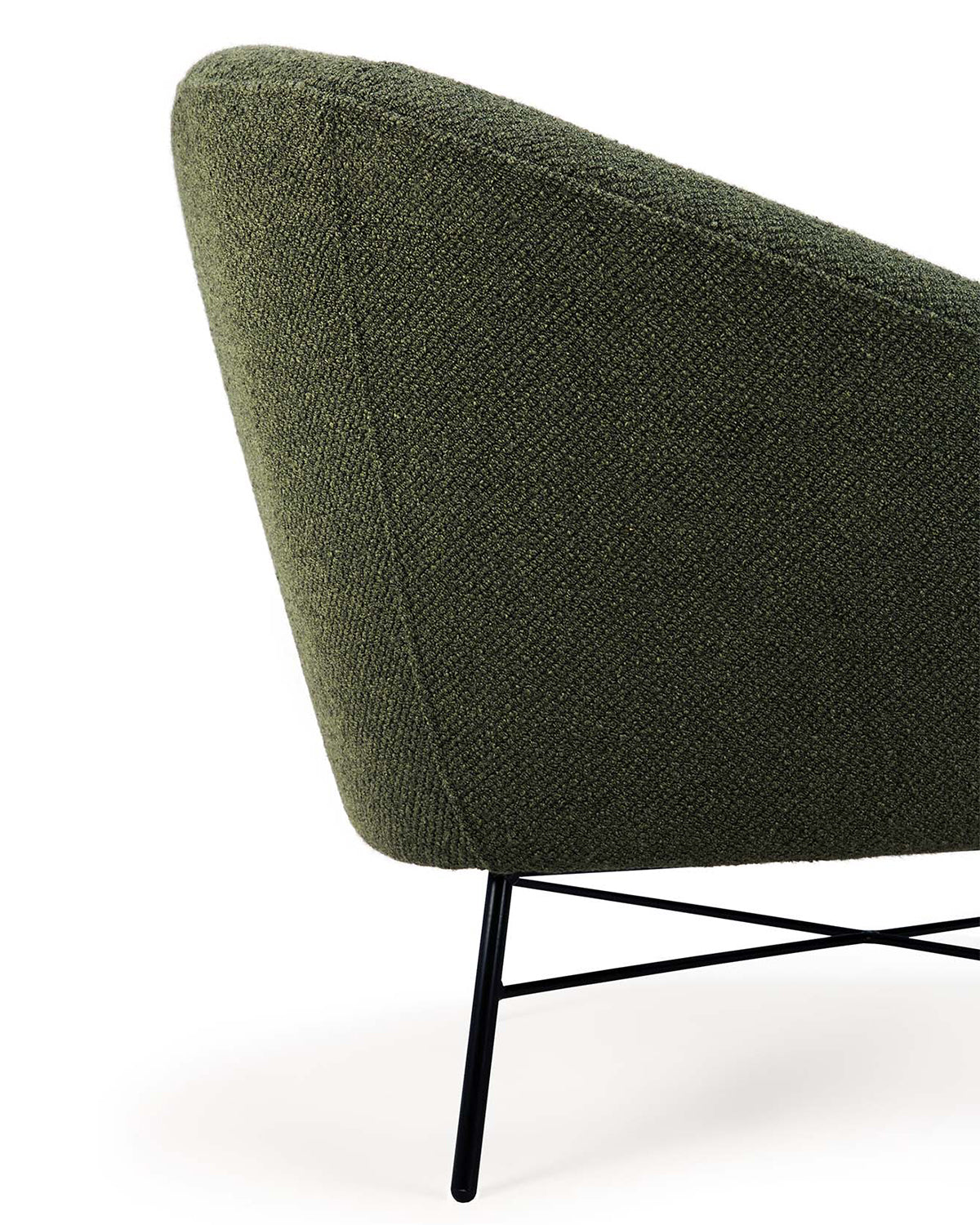 Close-up view of the Ethnicraft Barrow Lounge Chair – Pine, showcasing textured pine green upholstery and slim black metal legs, bringing a refined vintage touch against a white background.