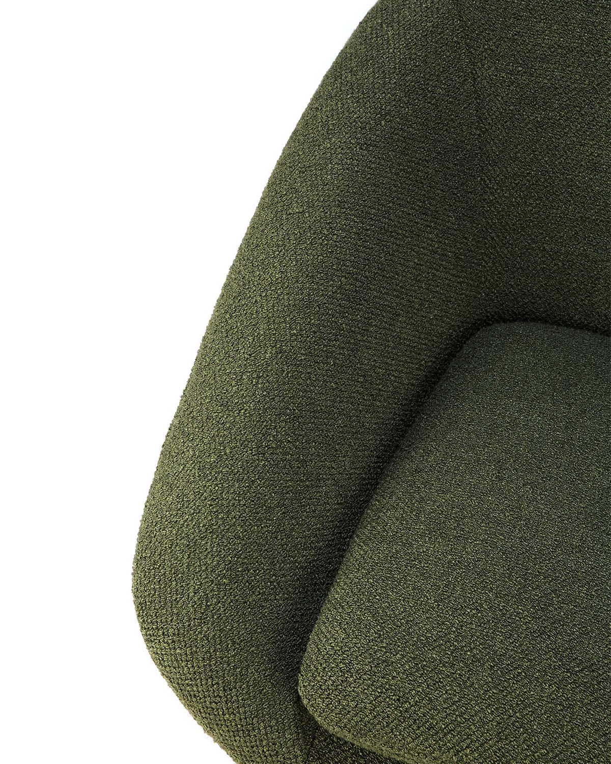 Close-up of the Ethnicraft Barrow Lounge Chair - Pine, featuring textured pine green upholstery and a curved backrest and seat cushion, set against a white background for a subtle vintage feel.