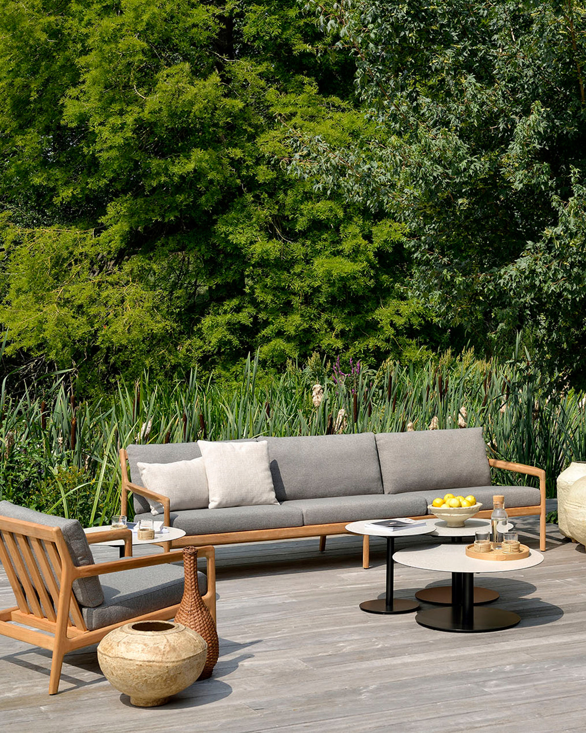 A modern patio features Ethnicrafts Jack Outdoor 3 Seater Sofa in teak with mocha cushions, a wooden chair, two round coffee tables with drinks and fruit, a woven basket, and lush greenery in the background.