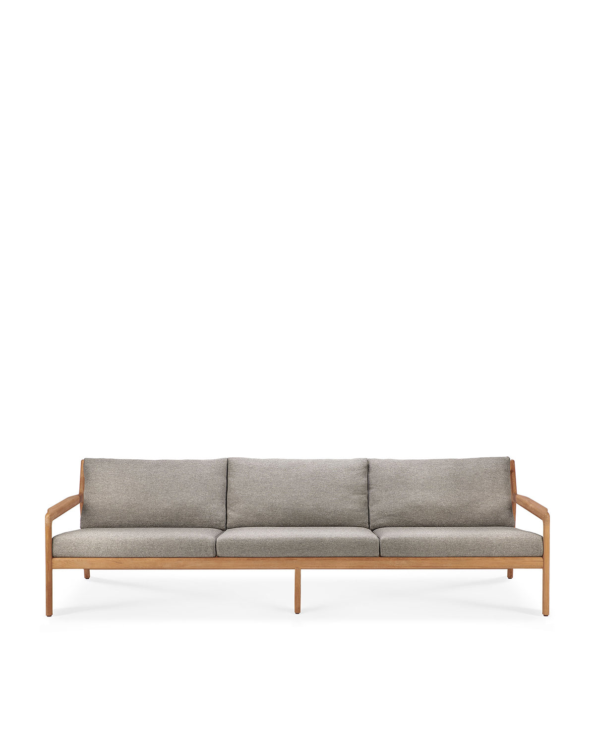 The Ethnicraft Jack Outdoor 3 Seater Sofa features a modern teak frame with armrests and mocha outdoor-grade seat and back cushions, offering stylish comfort for your outdoor space.