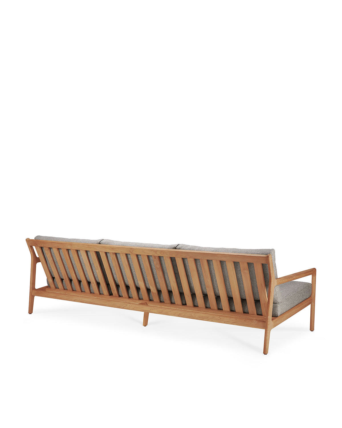 The Jack Outdoor 3 Seater Sofa - Teak with Mocha by Ethnicraft features a wooden frame, light gray outdoor cushions, angled vertical slats, and a minimalist design, shown here from the back.