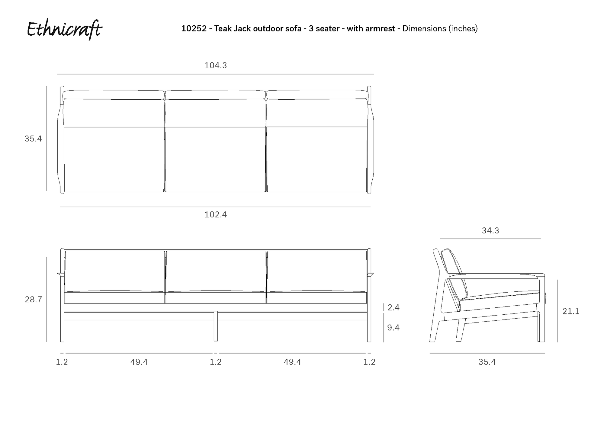 Front, side, and top views of the Ethnicraft Jack Outdoor 3 Seater Sofa - Teak with Mocha, featuring armrests and outdoor cushions. Dimensions (in): W104.3 x H35.4 x D34.3; seat height 15; armrest height 21.1.
