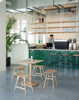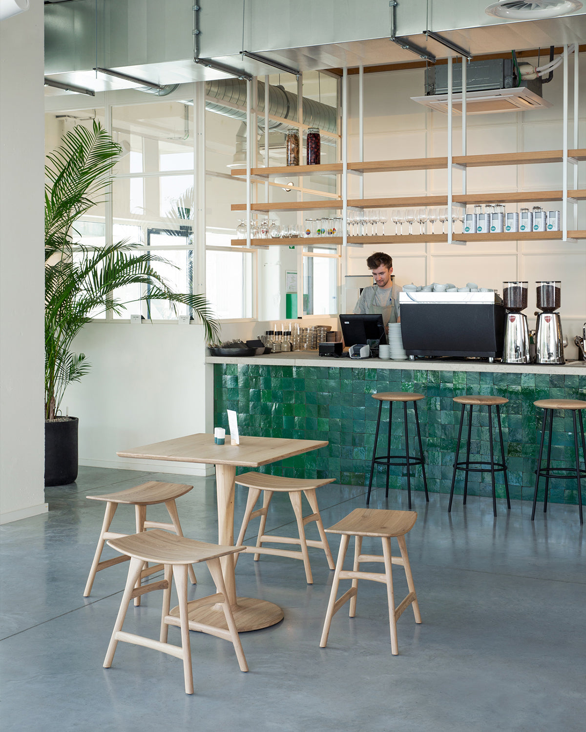 A modern café interior featuring the Ethnicraft Torsion Square Dining Table in solid oak, green tiled bar, wooden stools, potted plant, glassware on shelves, and a barista at the counter using a point-of-sale system.