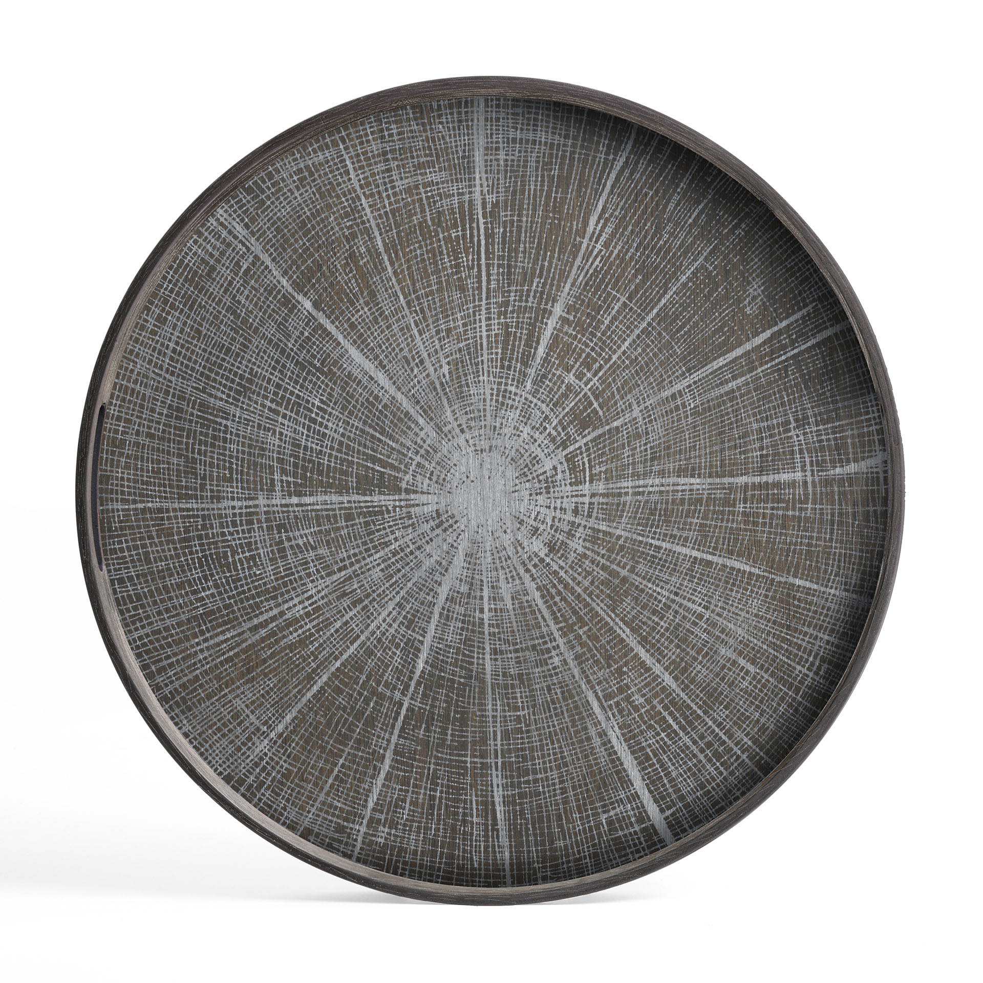 The Ethnicraft White Slice Wooden Tray - Round / Small features a dark outer rim and a textured, hand-painted tree ring pattern in light gray. Presented against a white background.