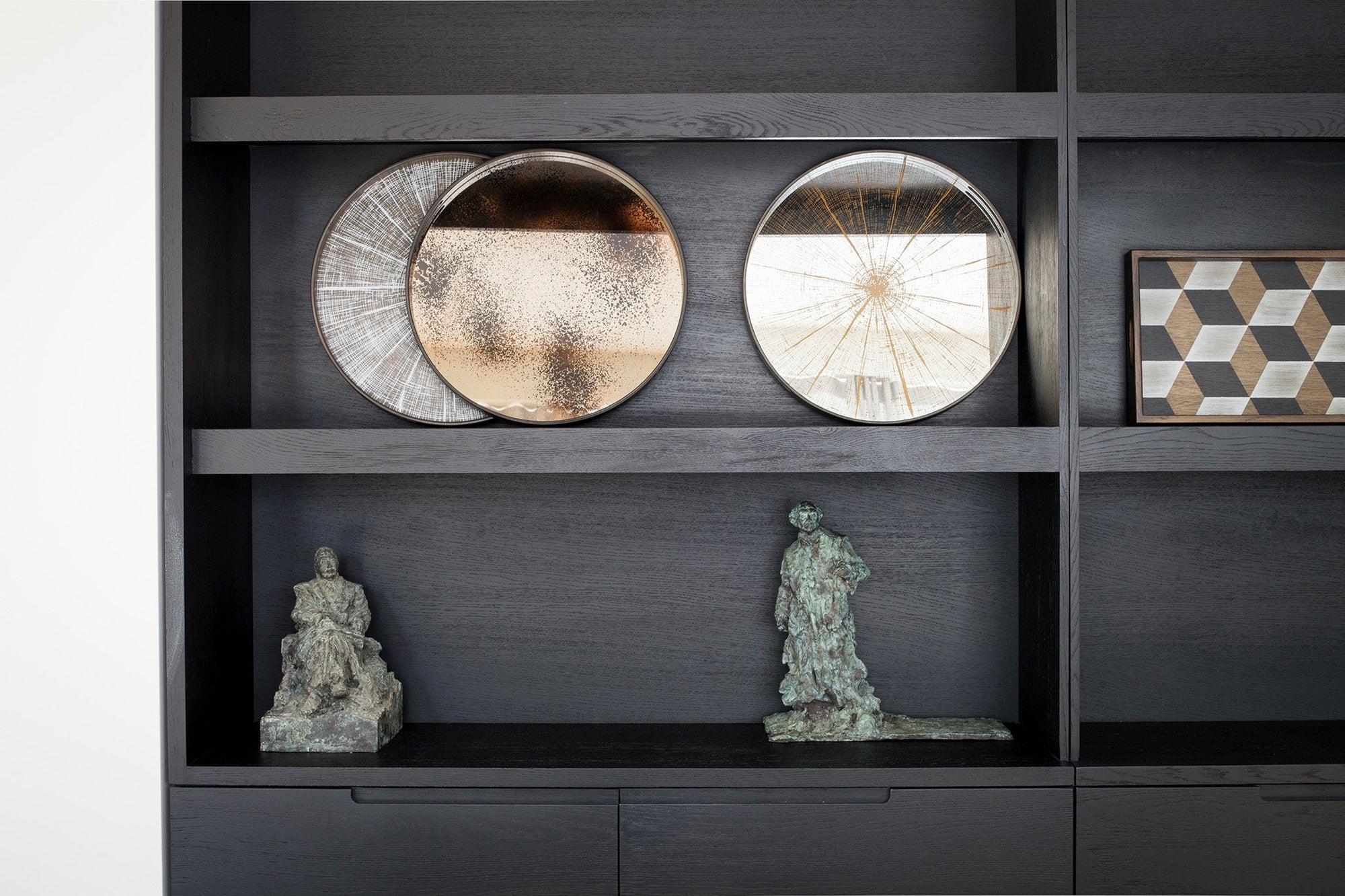 A dark wood Ethnicraft shelving unit displays two small, round White Slice Wooden Trays by Ethnicraft, a rectangular geometric artwork, and two small bronze robed figure sculptures on the lower shelf.
