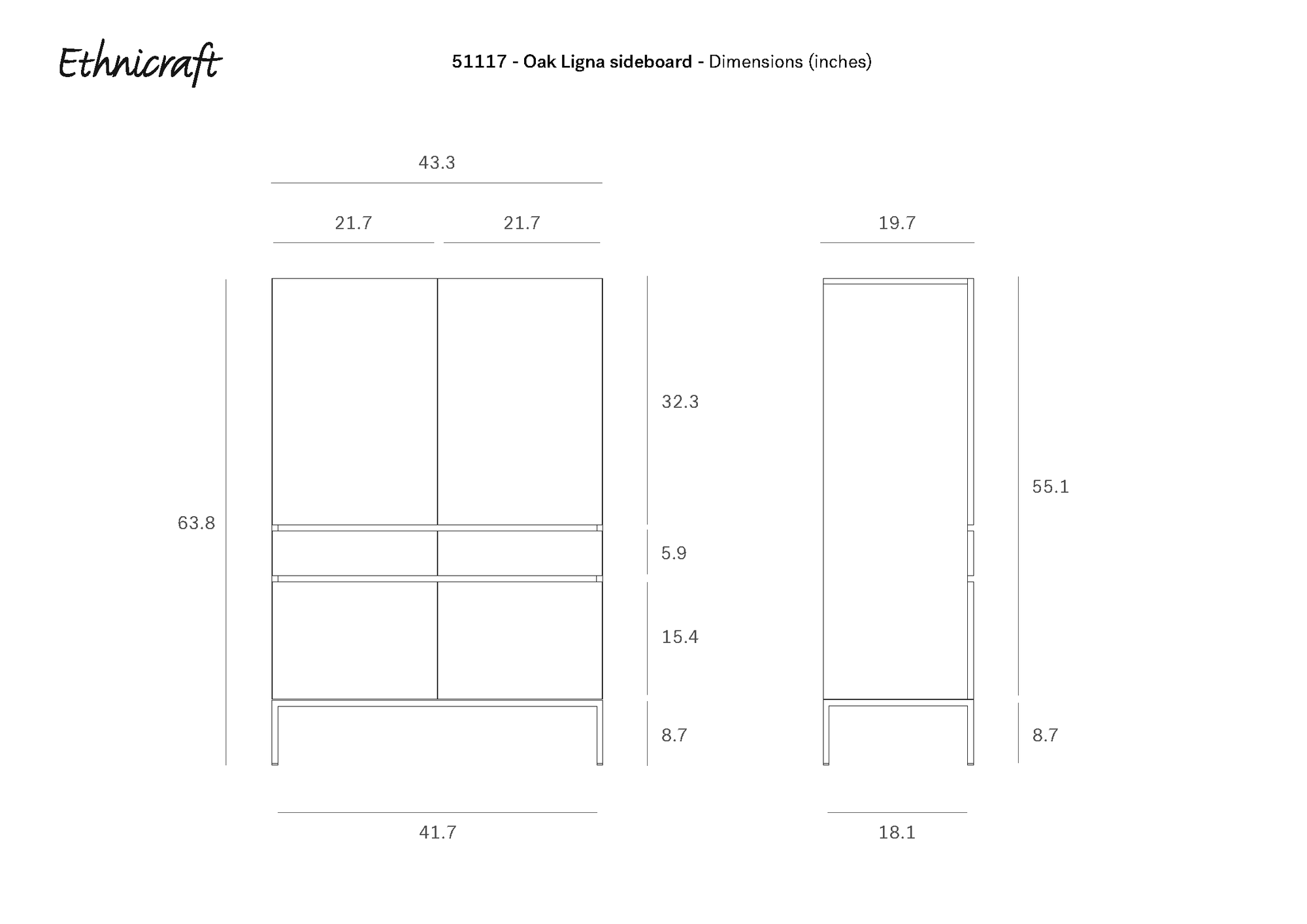 Solid European oak with an oiled finish and black powder coated metal legs. 4 doors and 2 drawers.