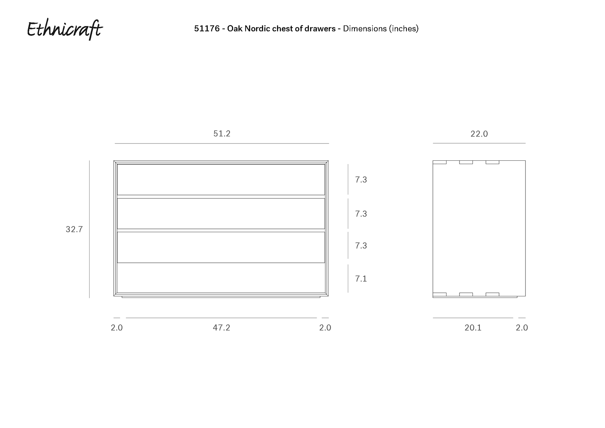 Line drawing of the Ethnicraft Nordic Dresser in solid European oak, with three drawers. Dimensions (in inches): width 51.2, height 32.7, depth 22.0; each drawer is approximately 7.3 inches high.