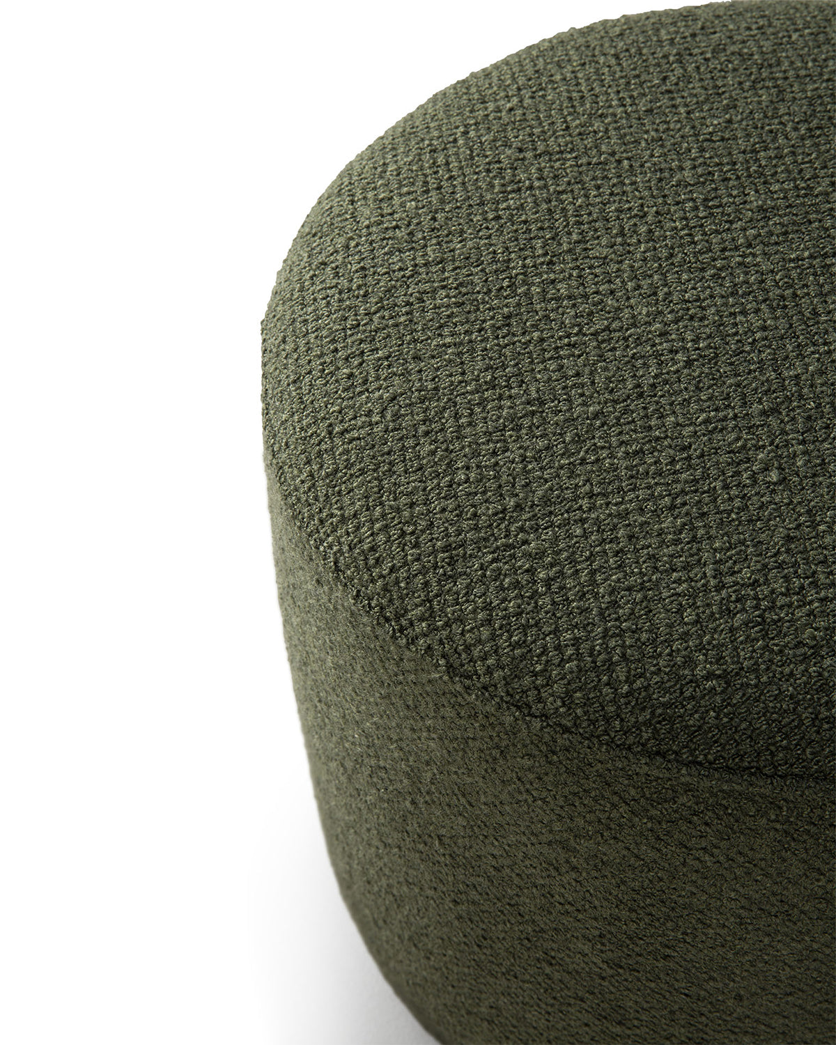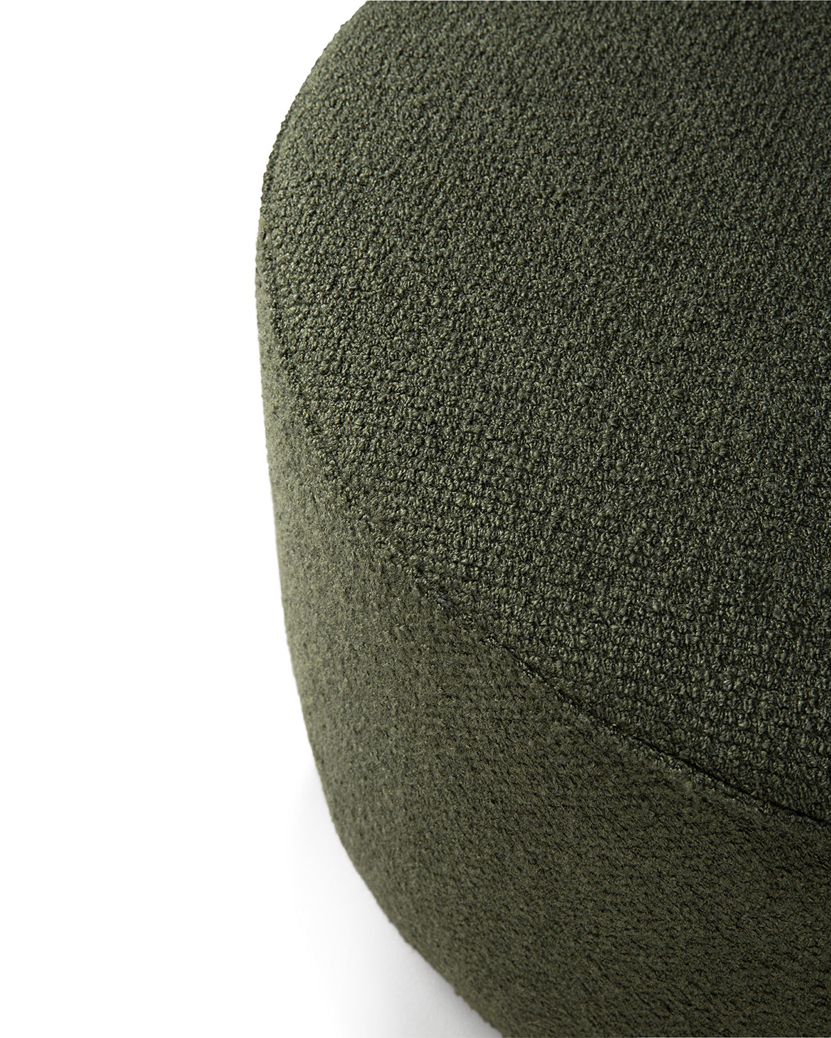 A close-up of the Barrow Pouf - Pine / Small by Ethnicraft, featuring round, green, textured fabric crafted from premium Italian materials—showing only the top and part of the side against a white background.