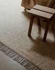 A rectangular Willow Rug - Eggshell by Armadillo&Co, featuring a light brown jute and wool blend, subtle textured pattern, and fringe on the short edges. Its simple, neutral look suits many décor styles.