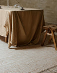 A table covered with a beige cloth sits on the Armadillo&Co Willow Rug in Eggshell. Nearby is a wooden bench, and the table features a glass vase with a branch, completing this minimal, neutral-toned room.