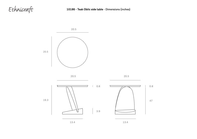 Line drawings display top, front, and side views with dimensions in inches of the Ethnicraft Oblic Side Table - Teak, crafted from FSC-certified teak for sustainable design.