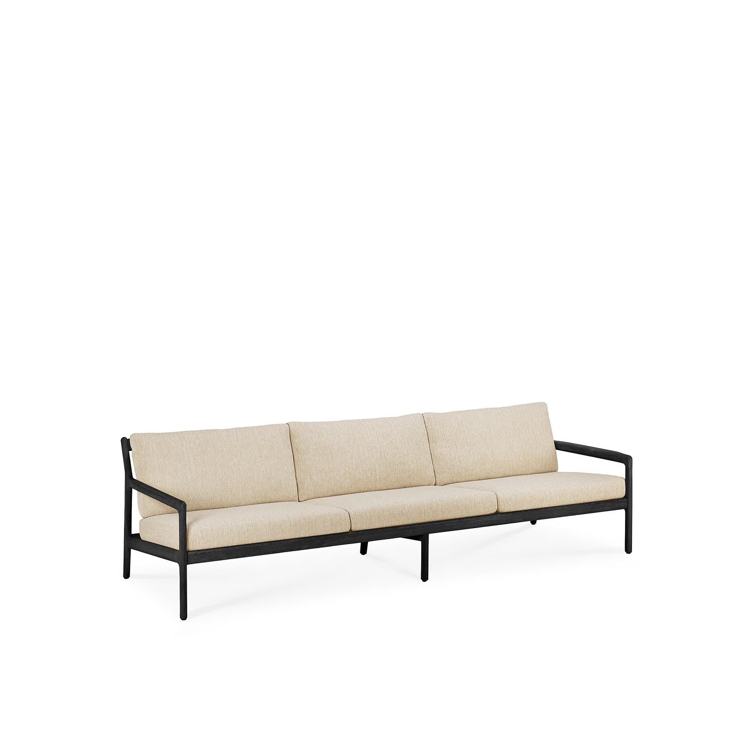 The Ethnicraft Jack Outdoor 3 Seater Sofa in Black Teak with Natural features minimalist beige cushions, a black teak frame, and modern design, shown against a plain white background.
