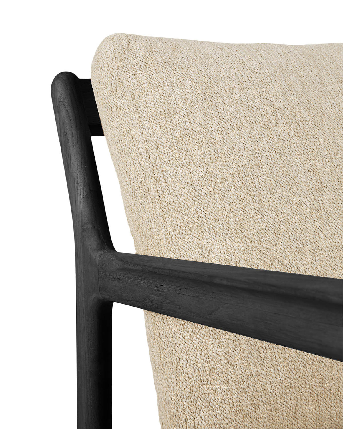 Close-up of the Ethnicraft Jack Outdoor 3 Seater Sofa, showcasing a sleek black teak frame paired with natural-toned cushions, set against a plain white background.