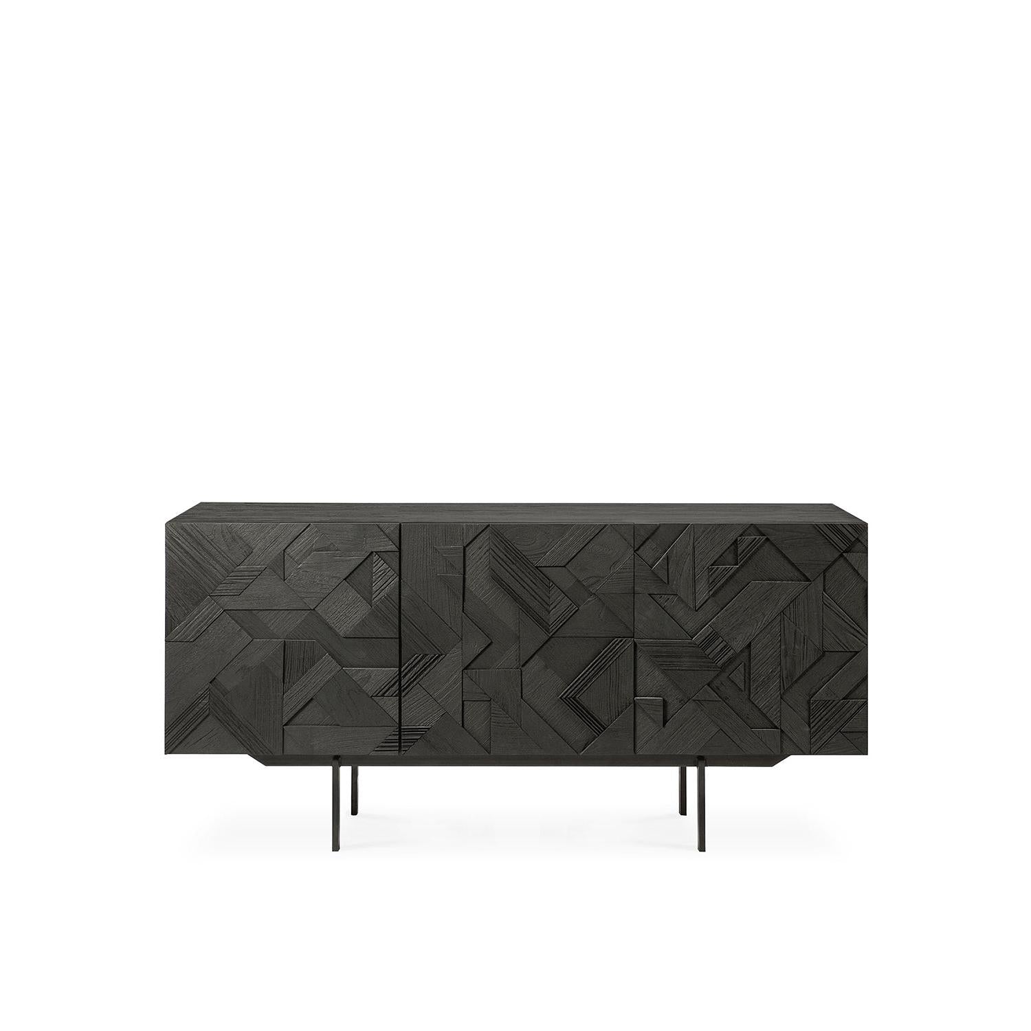 Solid black tainted teak with a varnished finish for extra protection. Contract grade and suitable for high traffic use. Black metal legs. 3 doors and 2 adjustable shelves.