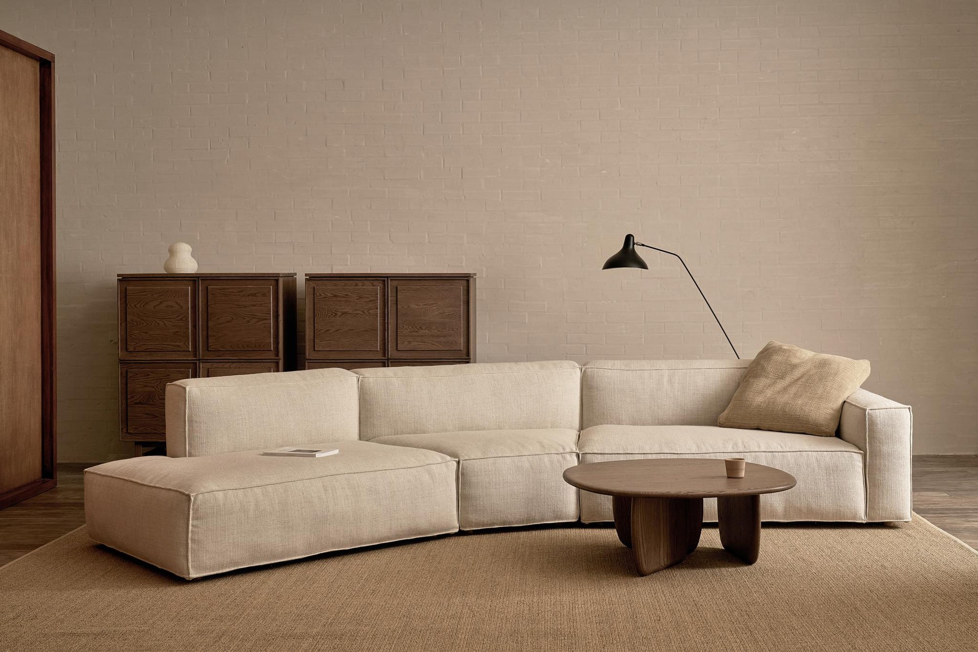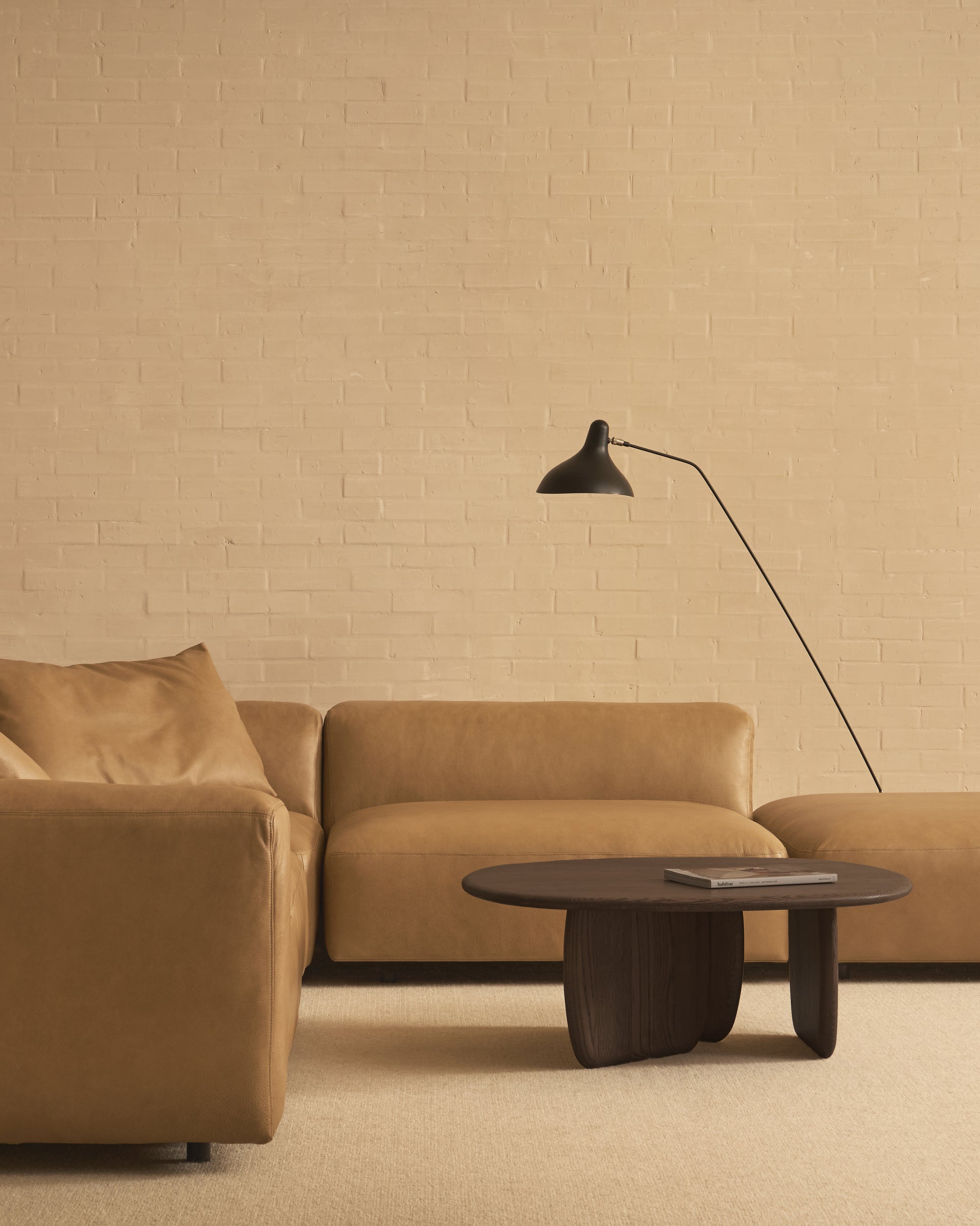 Modern living room with beige Eden sofa, round wooden coffee table, and black floor lamp against a beige brick wall.