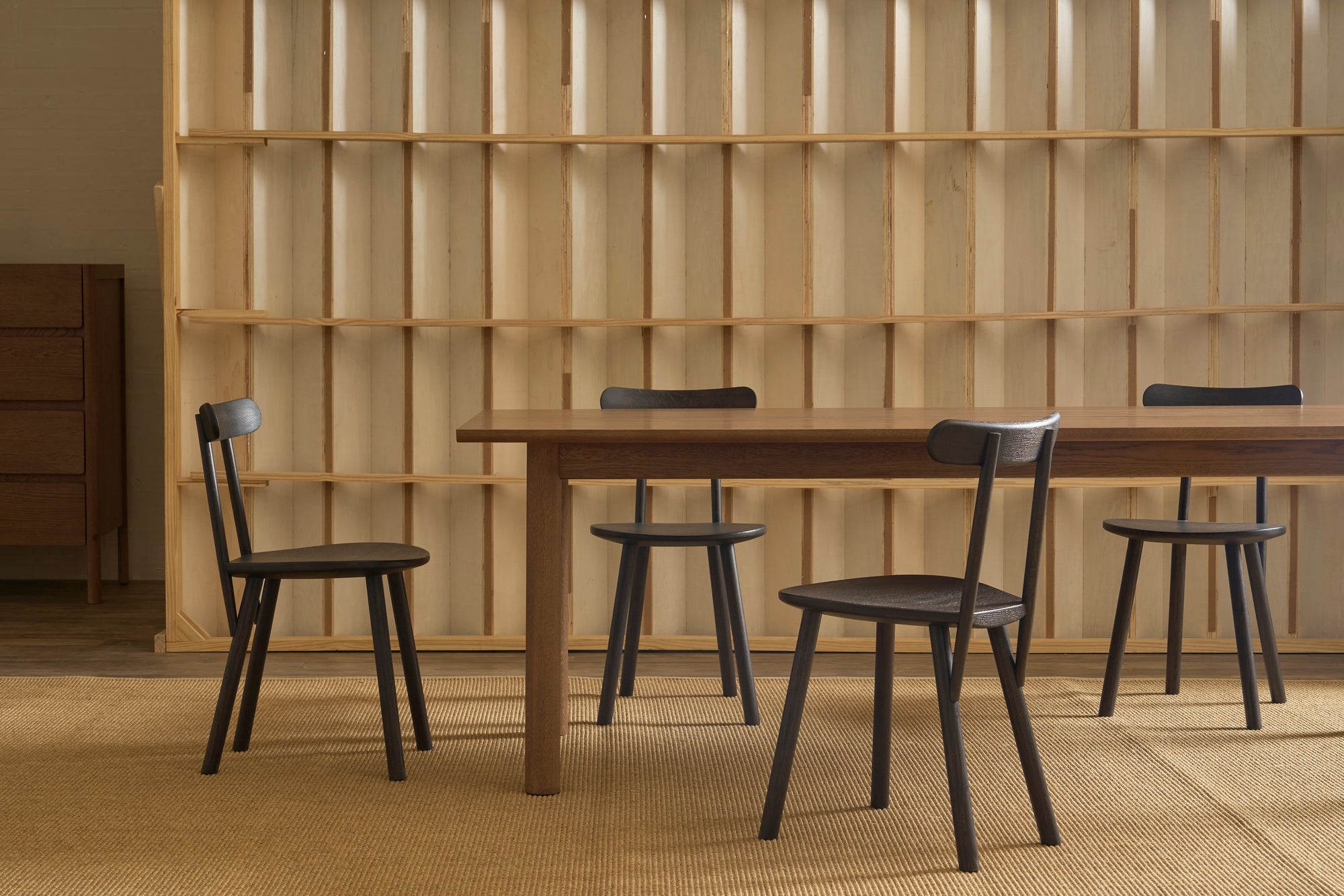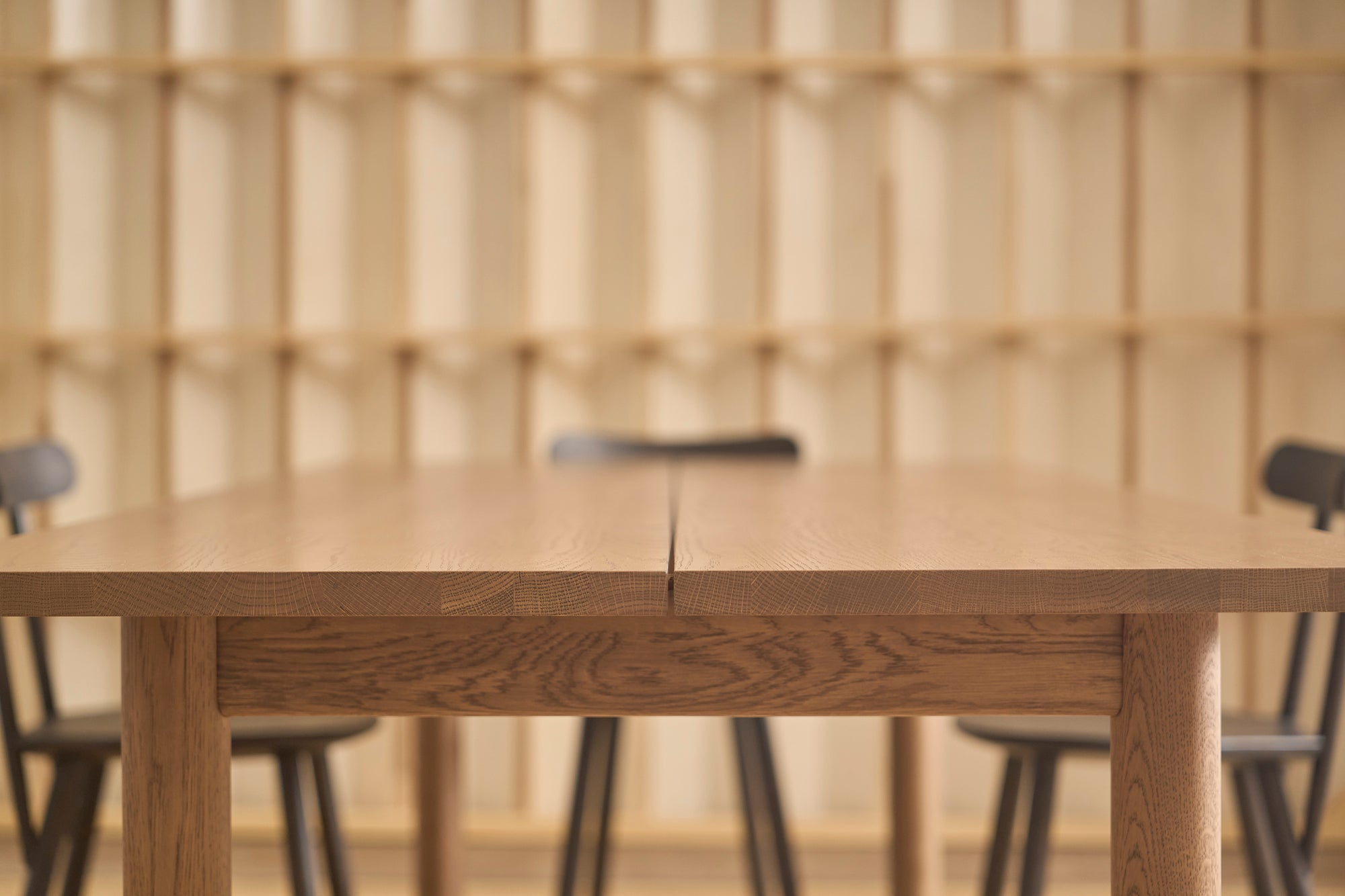 detail view of Itamae Wooden table with chairs in a blurred room setting