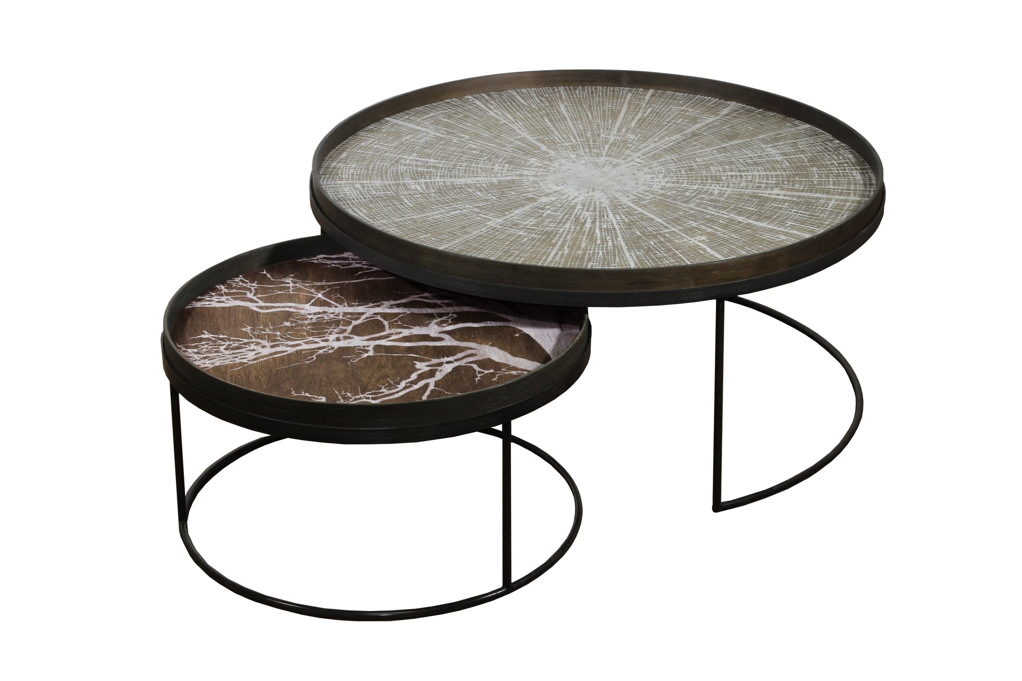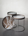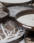 Stacked round Ethnicraft White Tree Wooden Trays feature cut-out handles and nature-inspired, silk-screen printed designs of tree branches on wood in neutral tones.