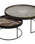 The White Tree Wooden Tray - Round / Large by Ethnicraft features a nature-inspired branch design on a brown wood top, supported by thin black metal legs, blending elegant patterns with modern style.