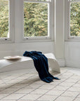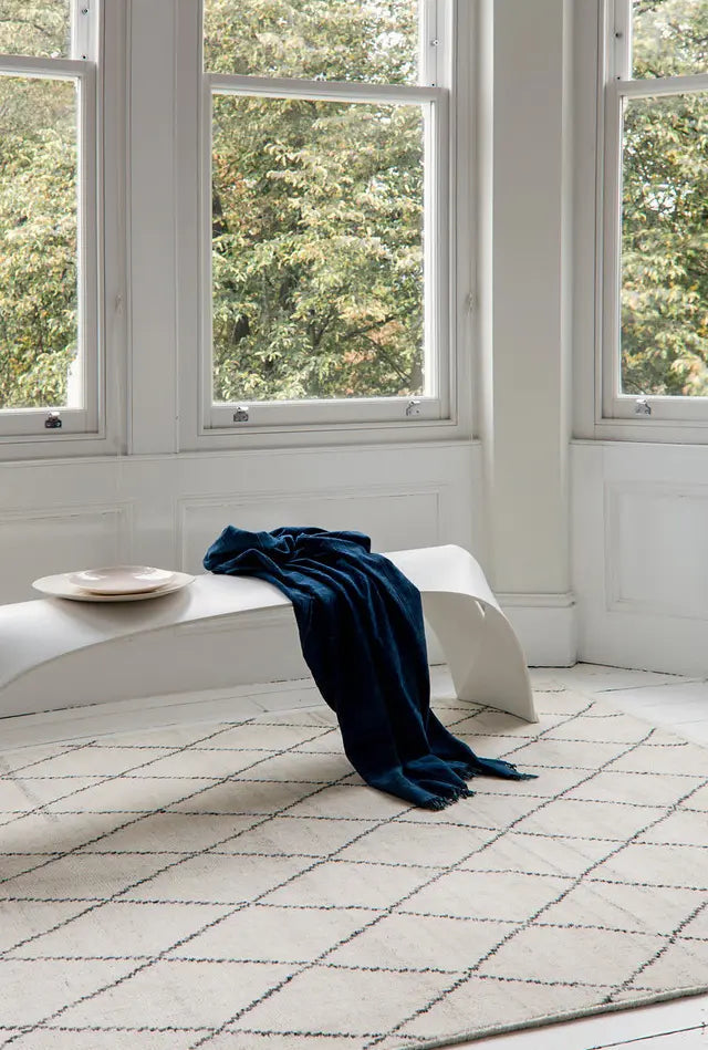 A modern, white minimalist bench with a navy blue throw sits on an Armadillo&Co Atlas Rug in Natural, positioned before large windows overlooking green trees. A round dish rests atop the bench.