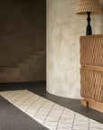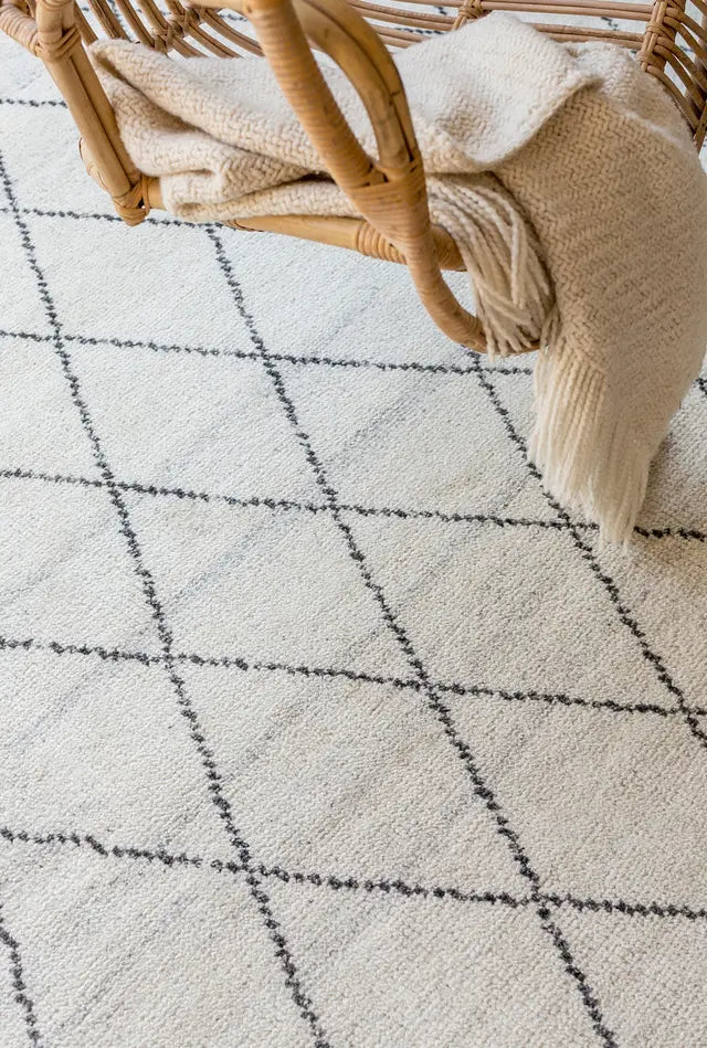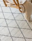 The Atlas Rug - Natural by Armadillo&Co features a minimalist off-white background with thin, dark lines forming a simple, repeating diamond pattern, capturing the timeless charm of Moroccan rugs in a hand-knotted design.