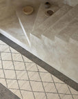 A calm, modern scene featuring textured white stairs, three neutral ceramic bowls, and the Armadillo&Co Atlas Rug - Natural with a black diamond pattern on a gray speckled floor.
