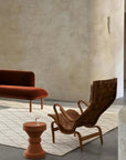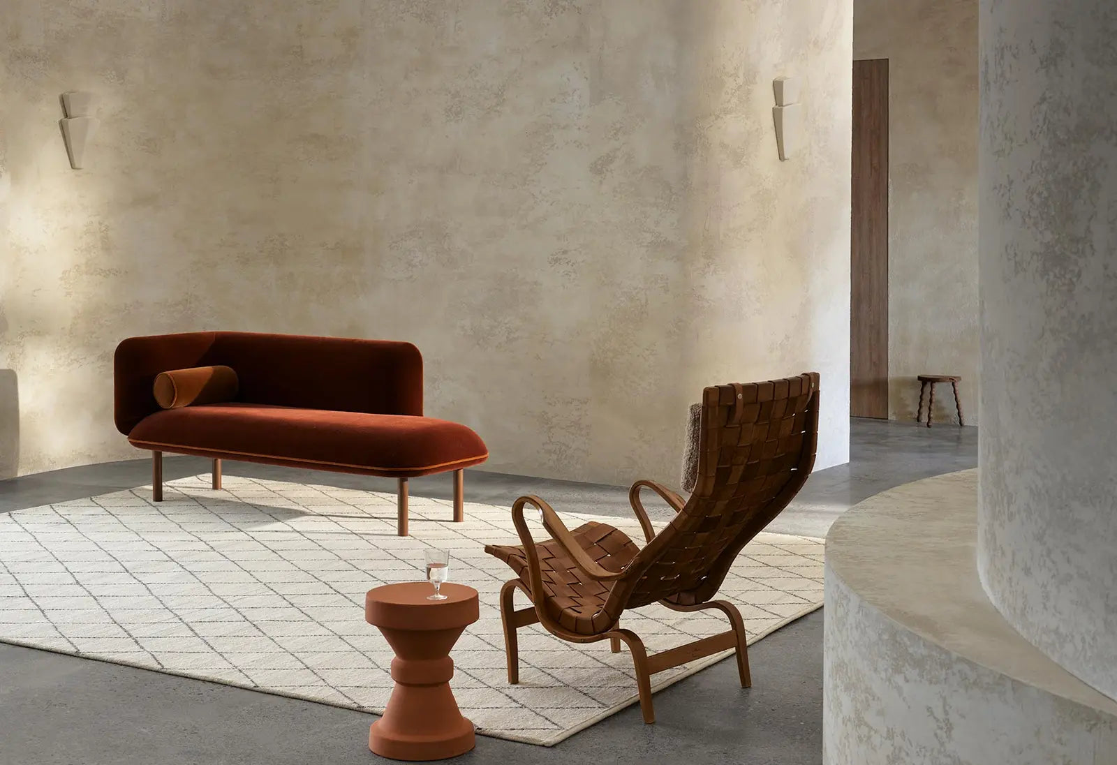 Minimalist living room with a red velvet chaise lounge, woven brown lounge chair, geometric side table holding a glass, and the Atlas Rug in Natural by Armadillo&Co set against a textured beige wall and concrete floor.