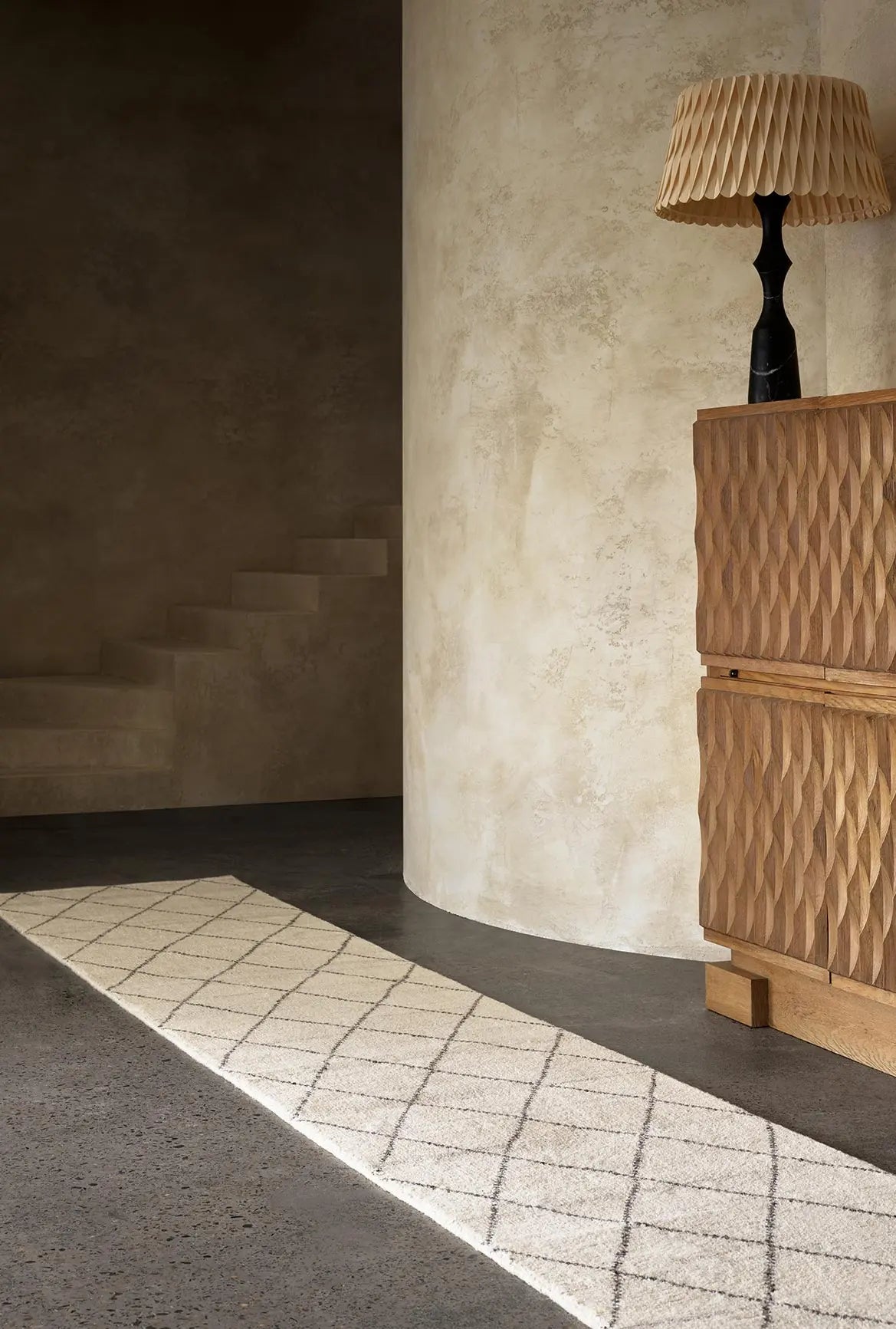 A minimalist interior featuring a curved beige wall, a geometric wooden cabinet, a matching lamp, concrete floor, and an Armadillo&Co Atlas Rug - Natural with a diamond pattern leading toward stairs in the background.