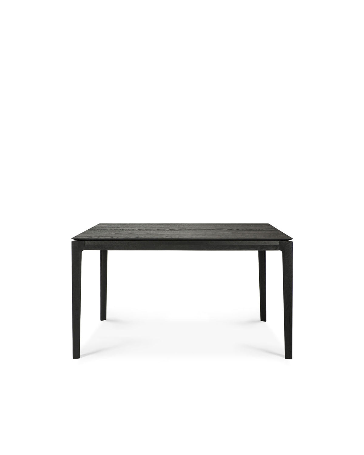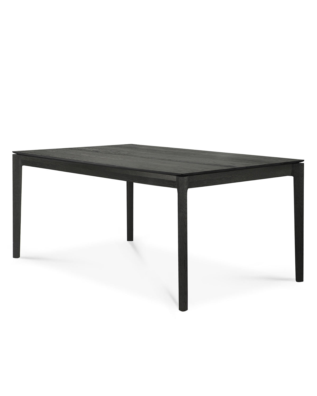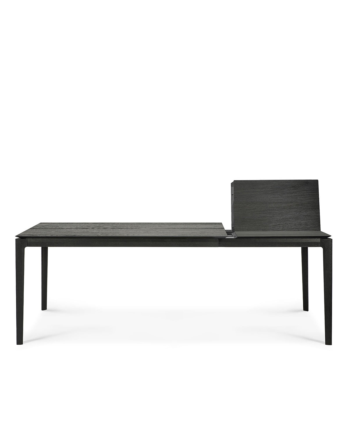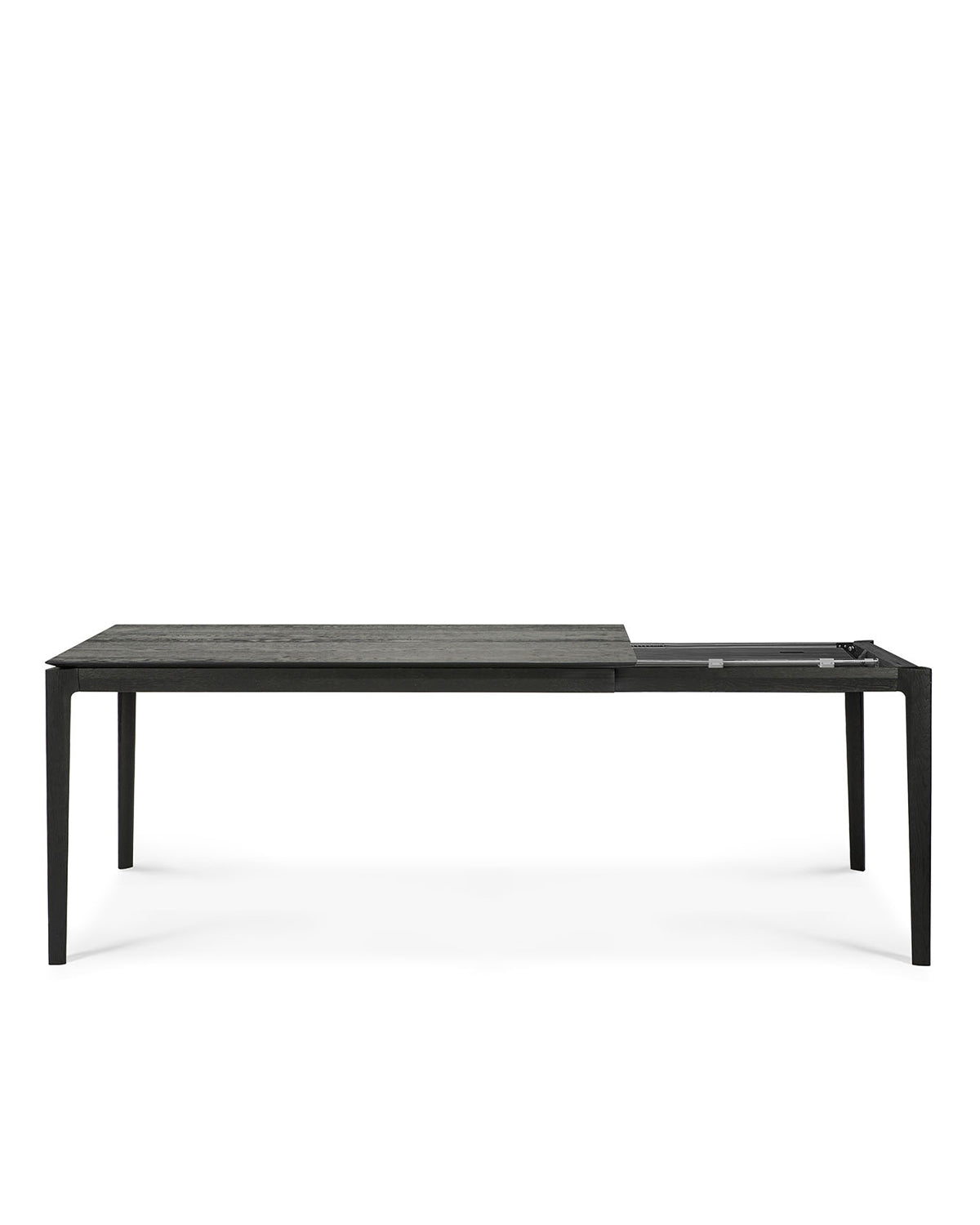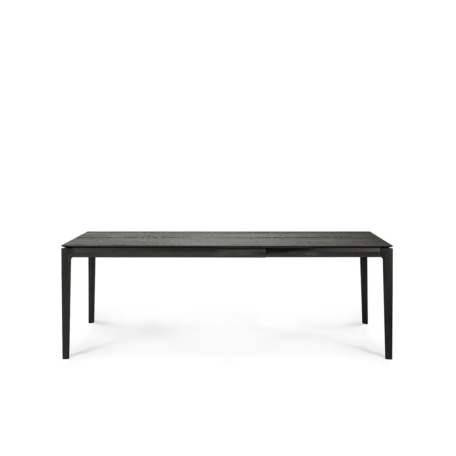 The Ethnicraft Bok Extendable Dining Table in black features a minimalist design with four slender legs and is shown against a white background.