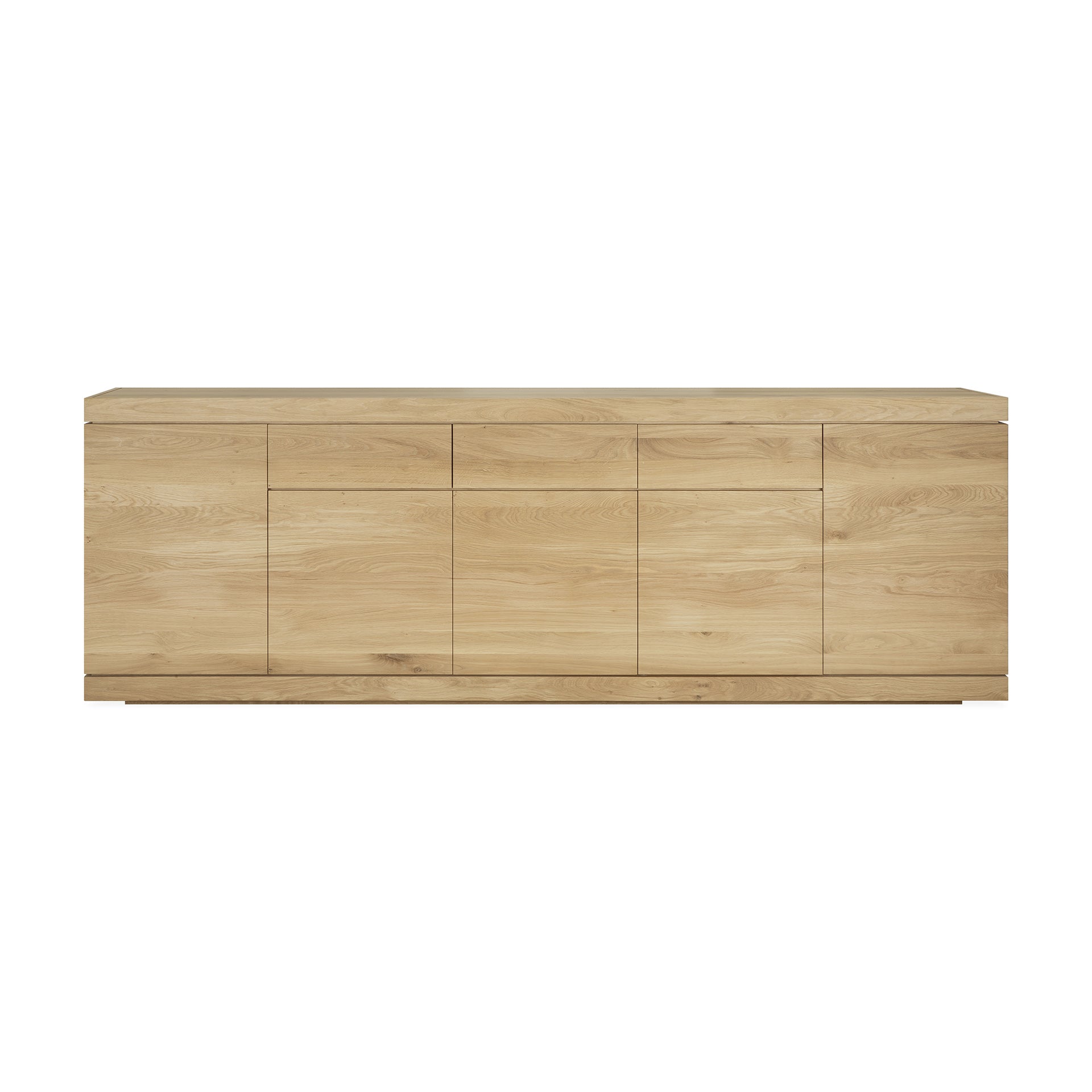 Introducing the Burger Sideboard - a luxurious addition to any dining or living space. The cascading natural wood patterns, solid oak construction, and impeccable craftsmanship make this sideboard a true standout. With ample storage space, it combines elegance and functionality for a truly exclusive piece. Features 5 push open doors and three drawers.