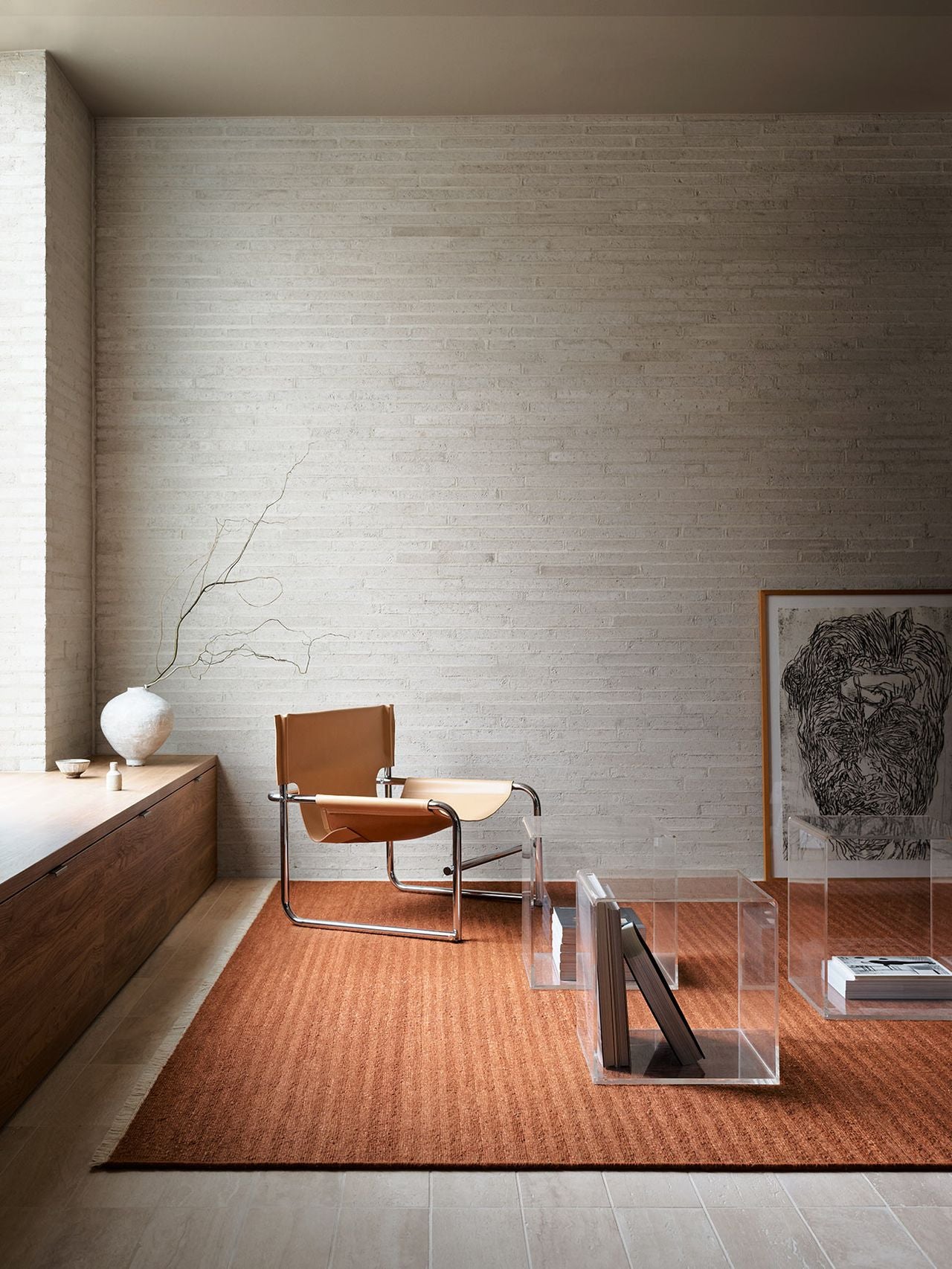 A soumak weave gives this rug its chevron pattern, with soothing shifts in tone and texture that command attention. Crafted from a luxurious mix of Italian and Argentinian wools, each nature-inspired color way is offset by a fine cotton fringe.