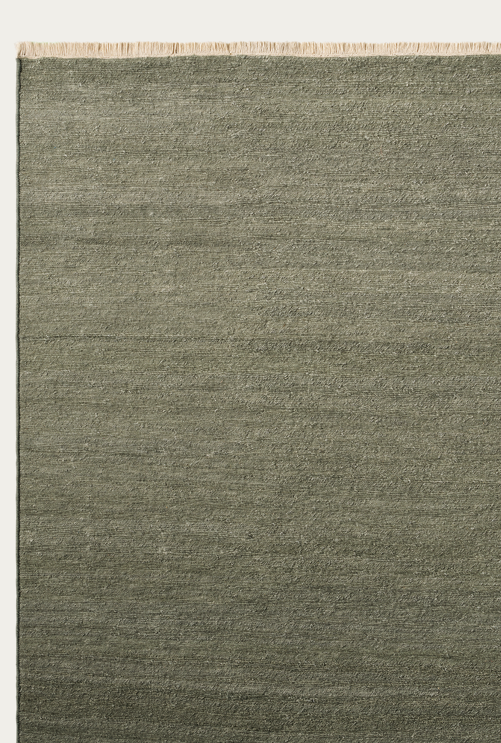 The Cable Rug - Jade by Armadillo&Co features a textured olive green soumak weave and short beige fringe along the top, reflecting the artisanal beauty of Armadillo rugs.