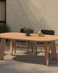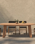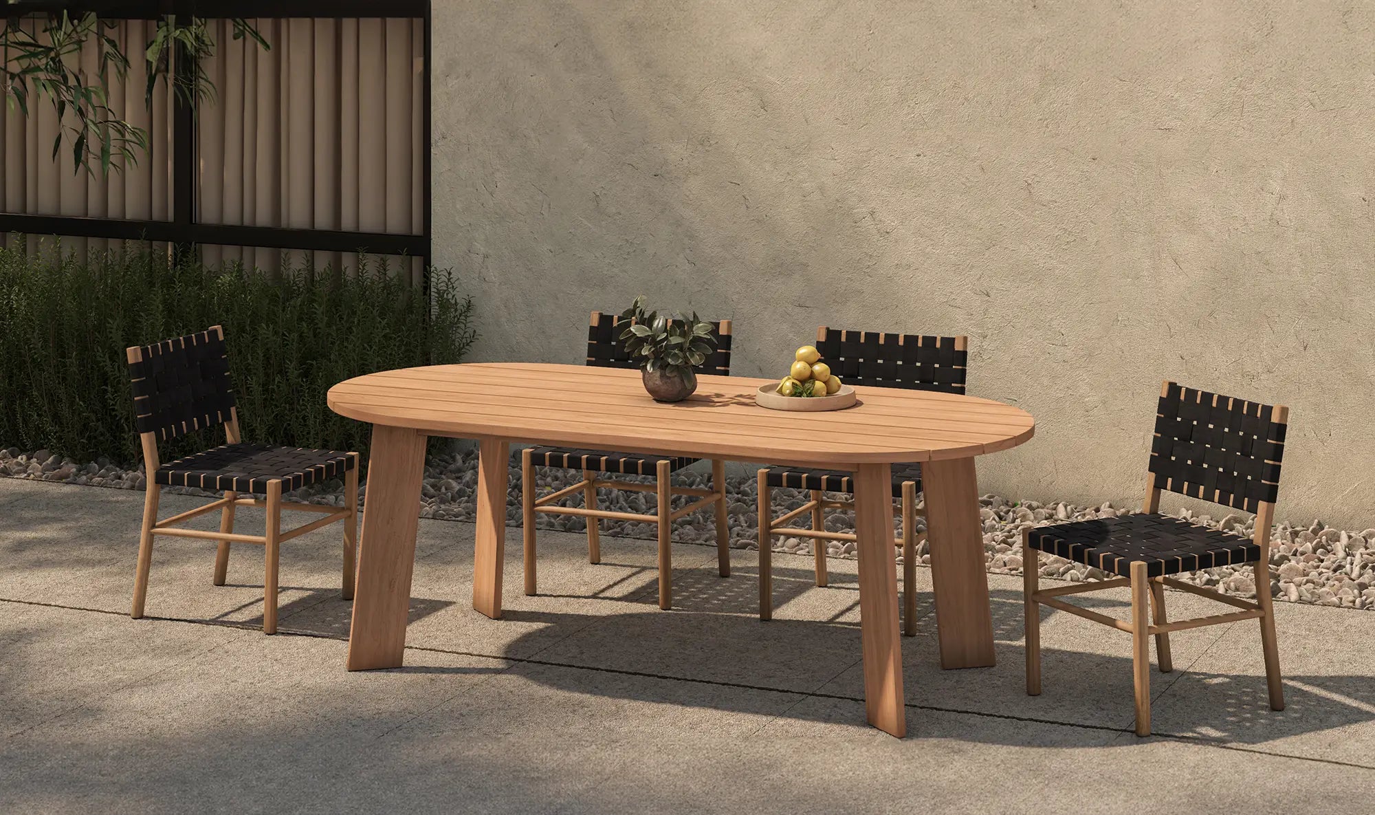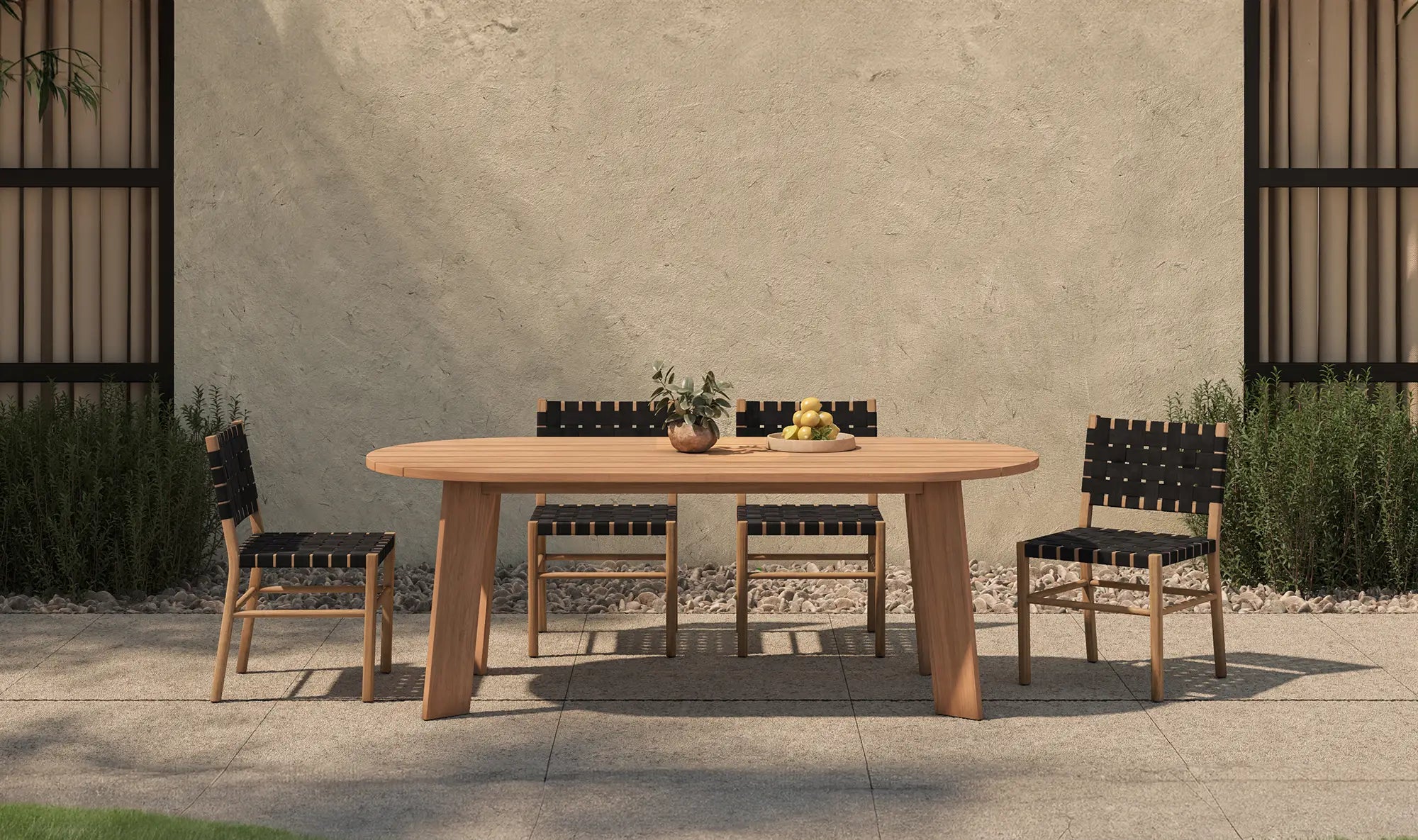 Embodying contemporary sophistication, this solid teak table celebrates natural material. The Delta outdoor dining table's angular legs provide a striking contrast to the oval, curved top, creating a minimalist yet elegant aesthetic. Over time, the table embraces a unique silver-grey patina as the teak and oils naturally weather. Though the process lends to its character, a teak sealer can be applied to maintain its original allure.