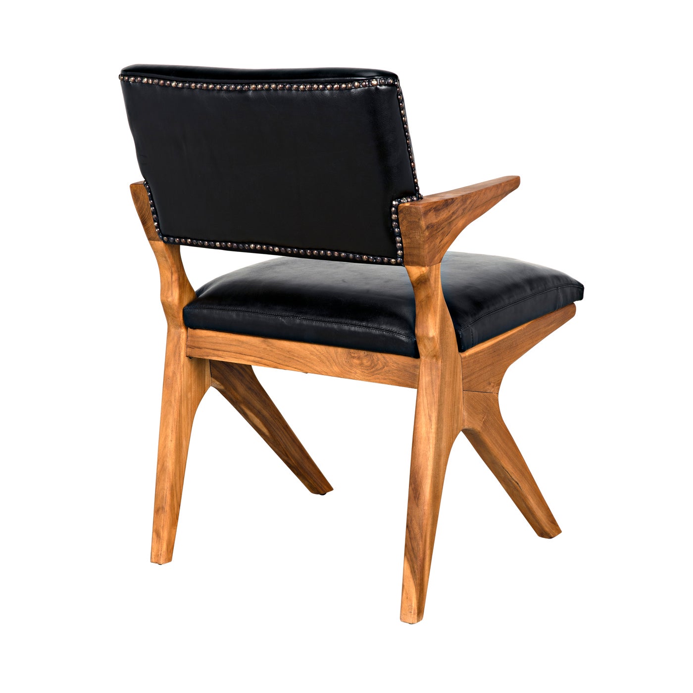 A stylish, mid-century frame is reimagined in variegated teak and paired with black leather and burnished brass nailheads.