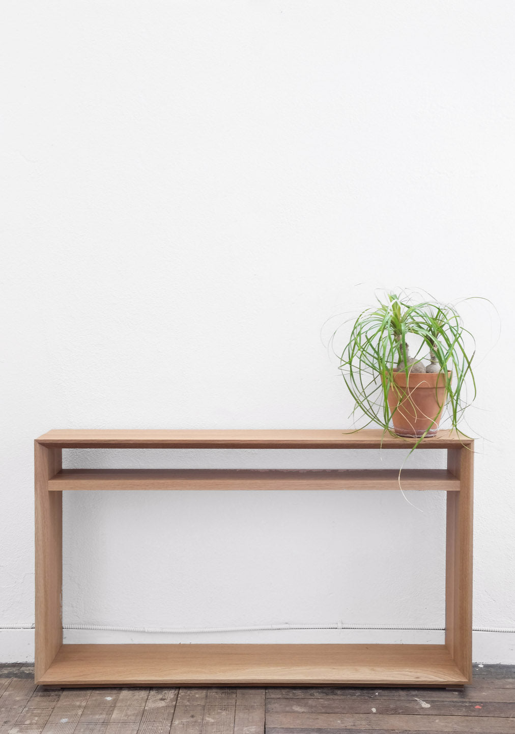 We loved this custom piece we designed for one of our local customers so much that we made it part of our permanent collection. The Emily Console features solid oak with softly beveled edges, a low, streamlined profile, an open shelf, and a subtle floating base detail. Finished in a durable matte finish that highlights the natural grain while standing up to everyday living. Made in Oakland.