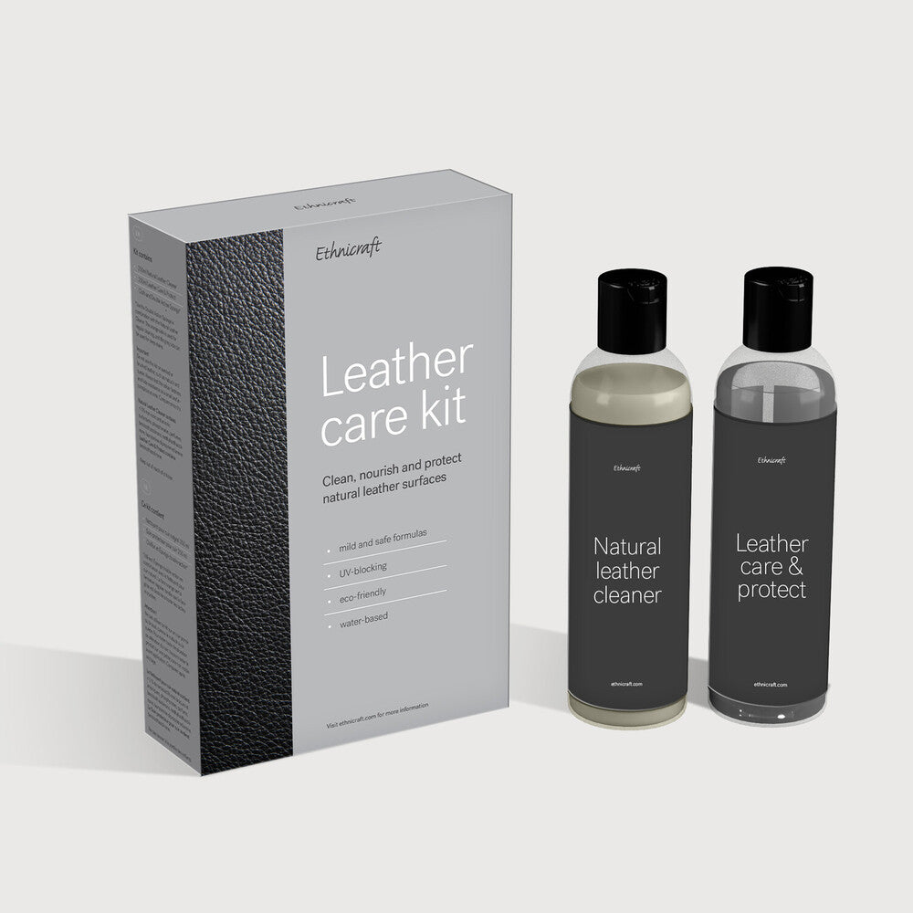 Keep natural leather items in the best condition by using our eco-friendly and water-based Ethnicraft Leather Care Kit. Containing a mild and safe Natural Leather Cleaner and specialized sponge, all leather surfaces are revitalized, effectively removing stains and previous layers of leather cream. The transparent Leather Care & Protect cream then nourishes and preserves leather suppleness, preventing stains and providing additional protection against dirt and moisture, skin oils and perspiration, UV and more. Regular maintenance extends the life and beauty of full-grain leather, keeping surfaces smooth and supple. Do not use on napped leather such as nubuck and suède.
