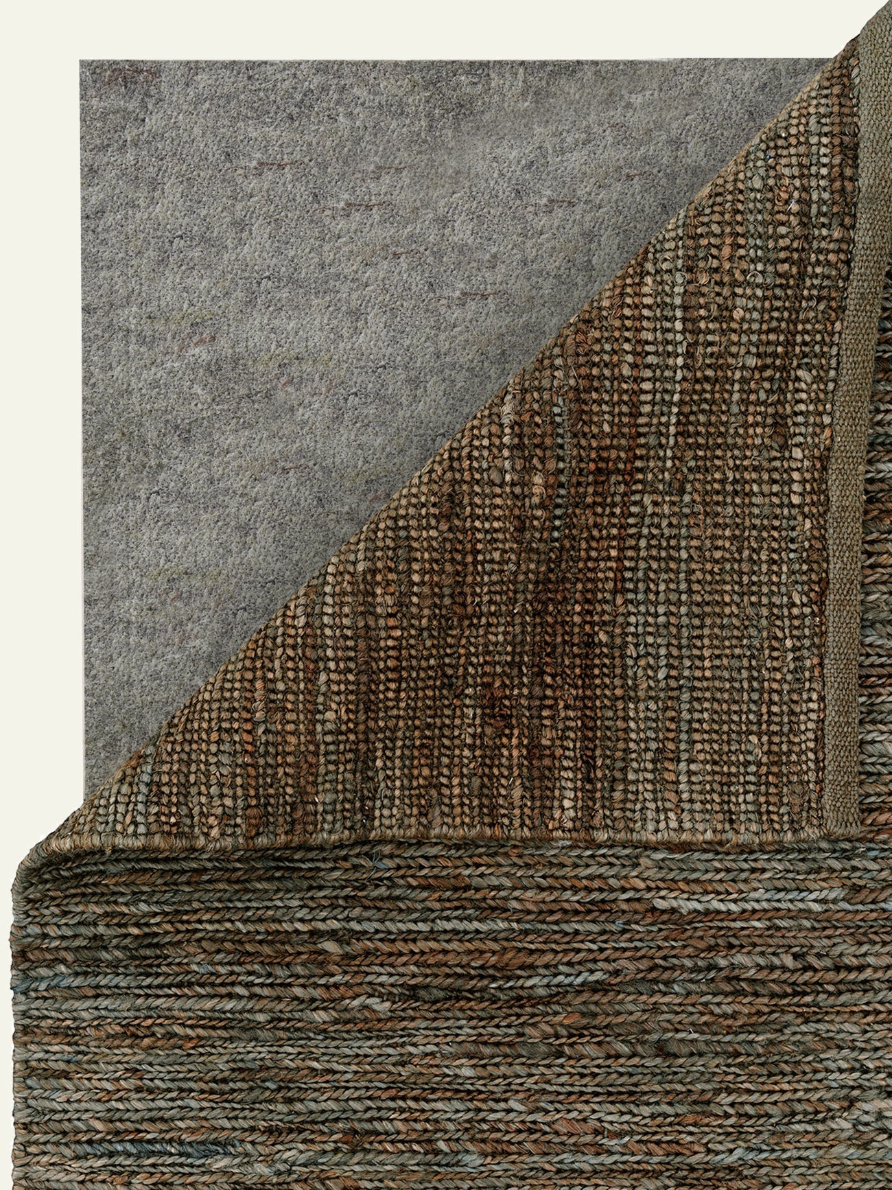A close-up of an Armadillo&Co Rug Pad shows its brown and gray woven design with one corner folded to reveal a solid gray recycled felt backing. The varied textures and earth-tone shades add depth and warmth.