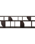 The Ethnicraft Geometric Console in varnished teak features three horizontal shelves with curved and straight vertical dividers, creating an abstract, geometric look. Crafted from FSC-certified teak for a modern touch.