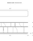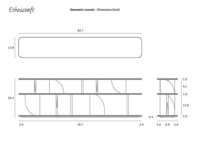 Line drawing of the Ethnicraft Geometric Console - Varnished Teak with dimensions in inches. This rectangular console features two shelves, geometric supports, and measures 82.7W x 26.4H x 13.8D.