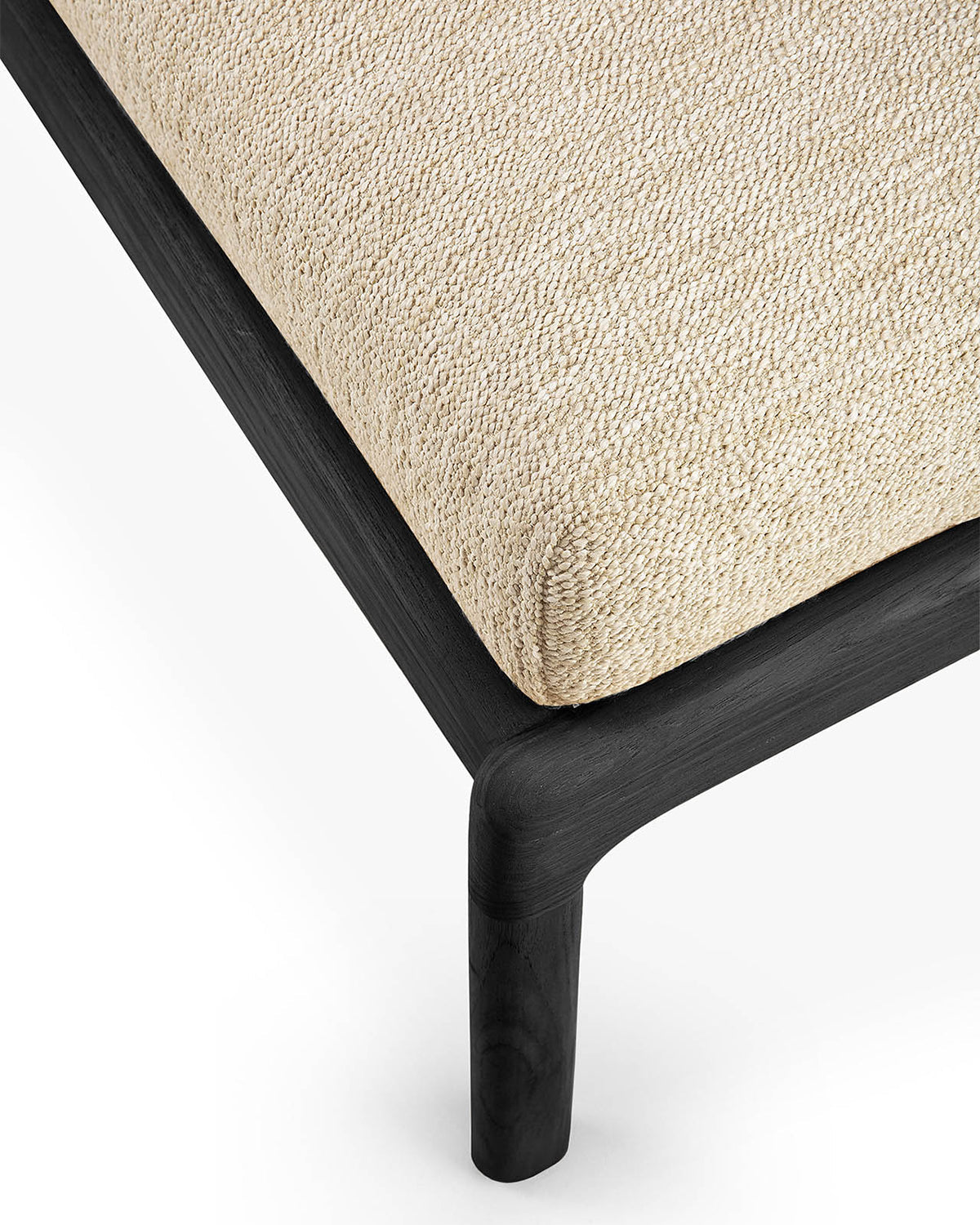 Solid FSC-certified teak with a brushed, black varnish finish. 100% polypropylene outdoor fabric and quick-dry outdoor foam.