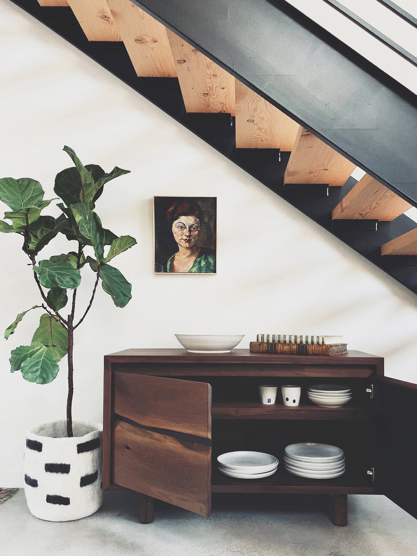 The SOBU Jupiter Sideboard - Walnut 2-Door sits under a staircase, topped with a white bowl and decor. A potted fiddle leaf fig and a portrait painting on the wall complete this minimalist, stylish interior scene.