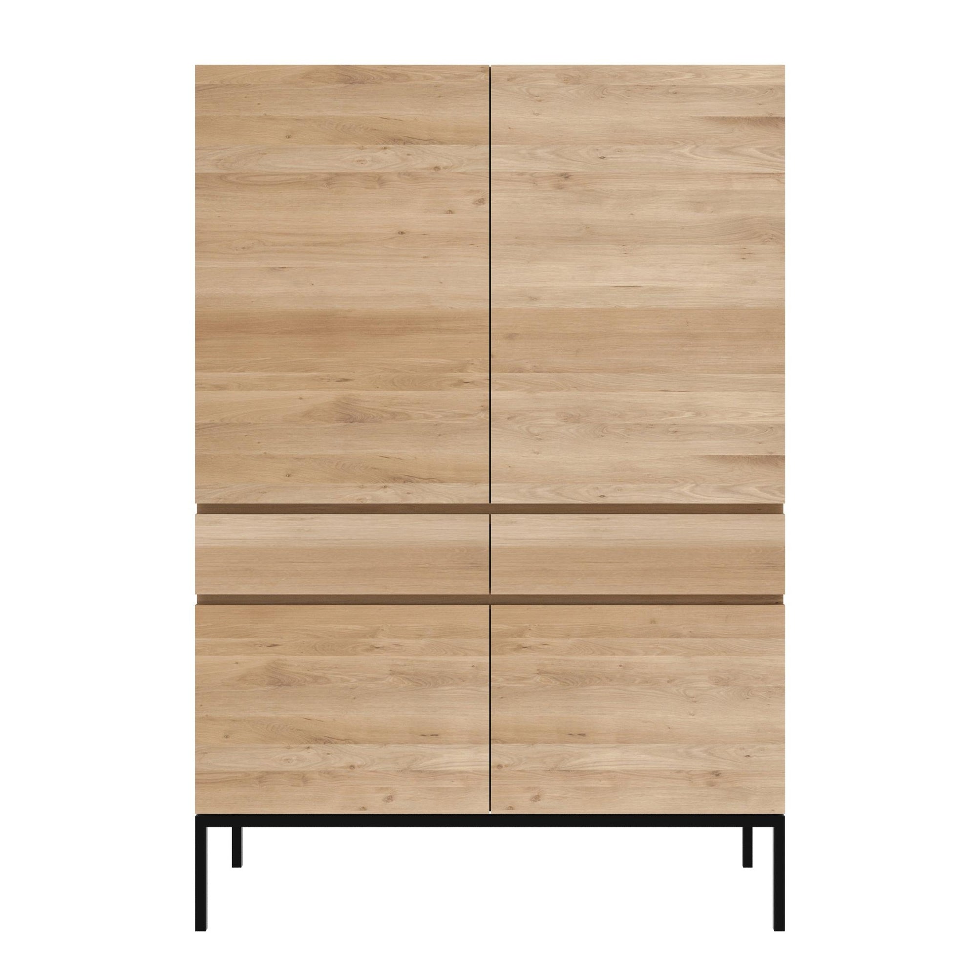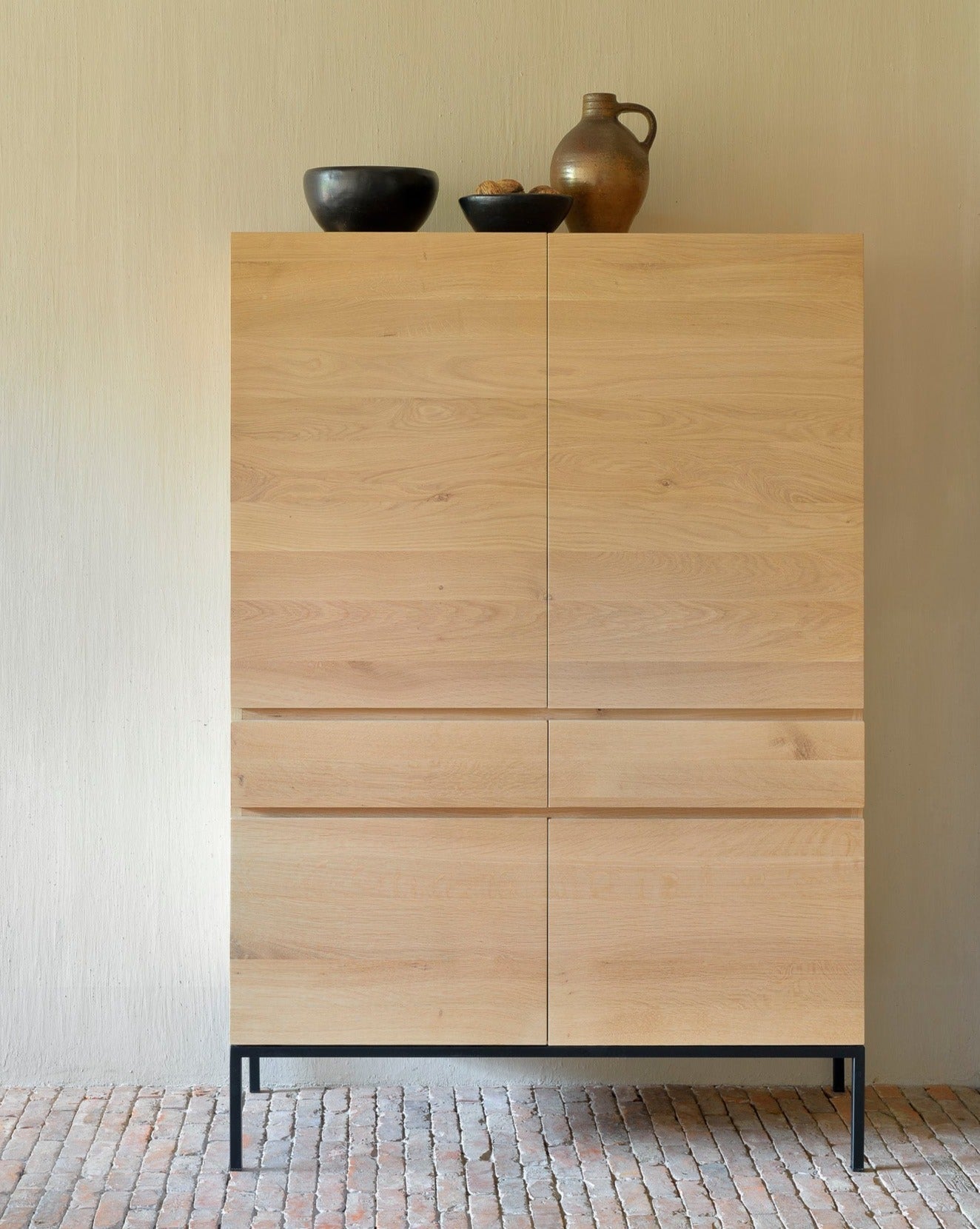 The Ethnicraft Ligna Storage Cupboard features four doors and two drawers in light European oak, set on slim black metal legs—a modern storage solution that showcases classic European refinement.
