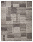 A close-up of the Loloi Manfred Rug - Charcoal / Dove highlights its rectangular, hand-knotted patchwork design with textured woven patterns in neutral tones and a soft, plush surface.